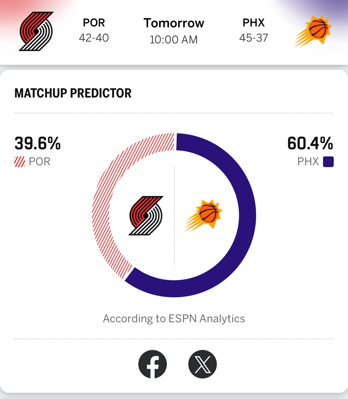 ESPN预测明天附加赛胜率:太阳60.4%,开拓者39.6%太阳和开拓者的胜者成