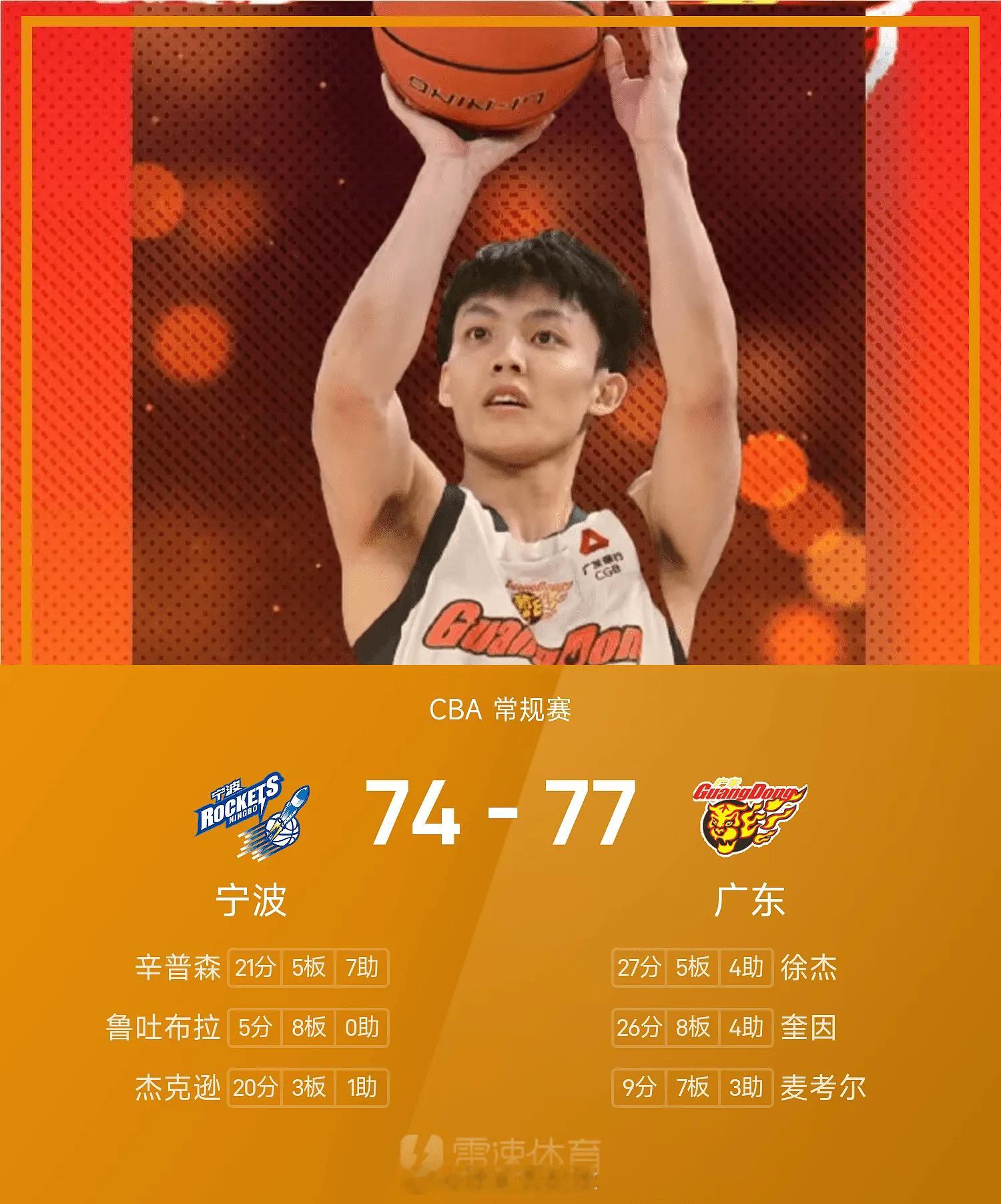 04月14日讯 25/26赛季CBA 常规赛,广东对阵宁波。双方全场战罢,广东77-74战胜宁波。徐杰砍下全场最高的27分5板4助,率领广东成功取胜。CBACBA徐杰体育CBAcba