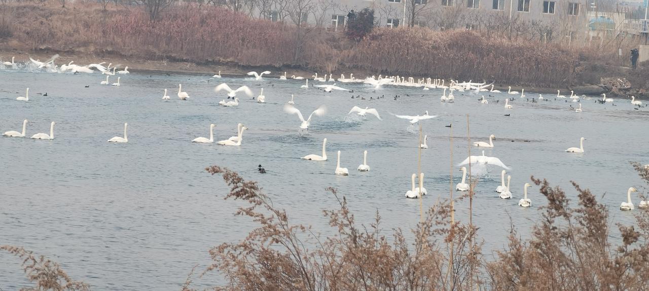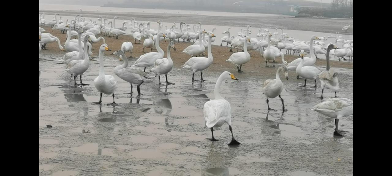 当我举着手机对着一堆天鹅,期待它们中间有一个会拍打翅膀,展开羽翼,被我抓拍到,结果却不尽人意,我盯了半天的一堆天鹅纹丝不动,在它们的前后左右却时不时的有天鹅展翅,我赶紧把镜头转过去,瞄准,已经迟了,刚才亮翅的那只天鹅已经运动完毕,安安静静的干起了别的。