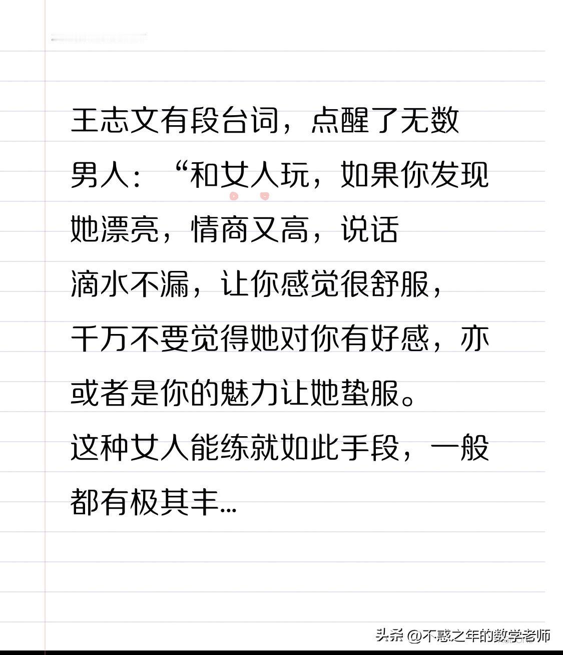 “和女人玩,如果你发现她漂亮,情商又高,说话滴水不漏,让你感觉很舒服,千万不要觉得她对你有好感,亦或者是你的魅力让她蛰服。这种女人能练就如此手段,一般都有极其丰富的经验。你以为能把住这种女人,殊不知你在她眼中才是猎物。”