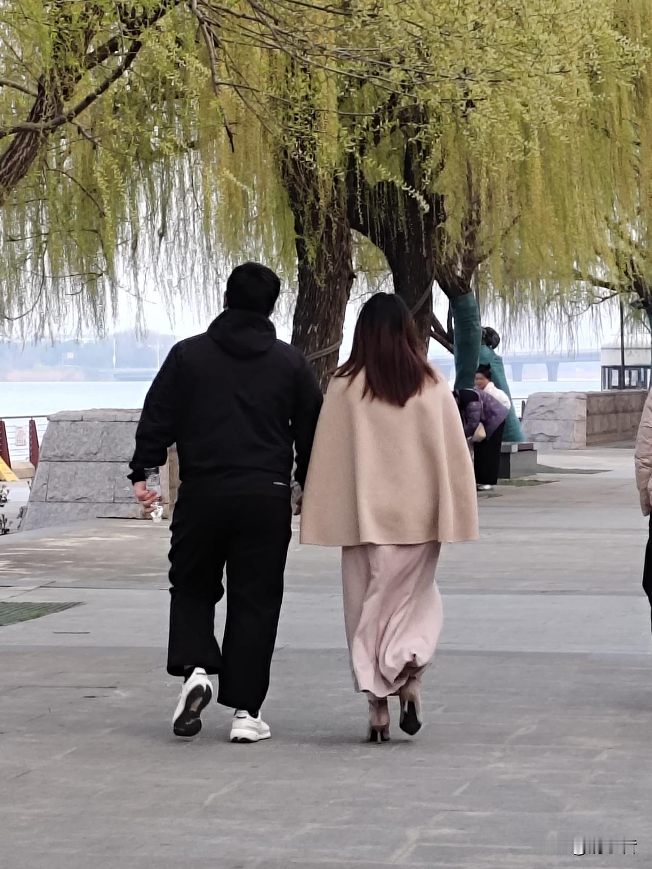 在公园逛,看到一个美女,穿件短斗篷,配条鱼尾长裙,蹬个细高跟鞋,可美可美了。