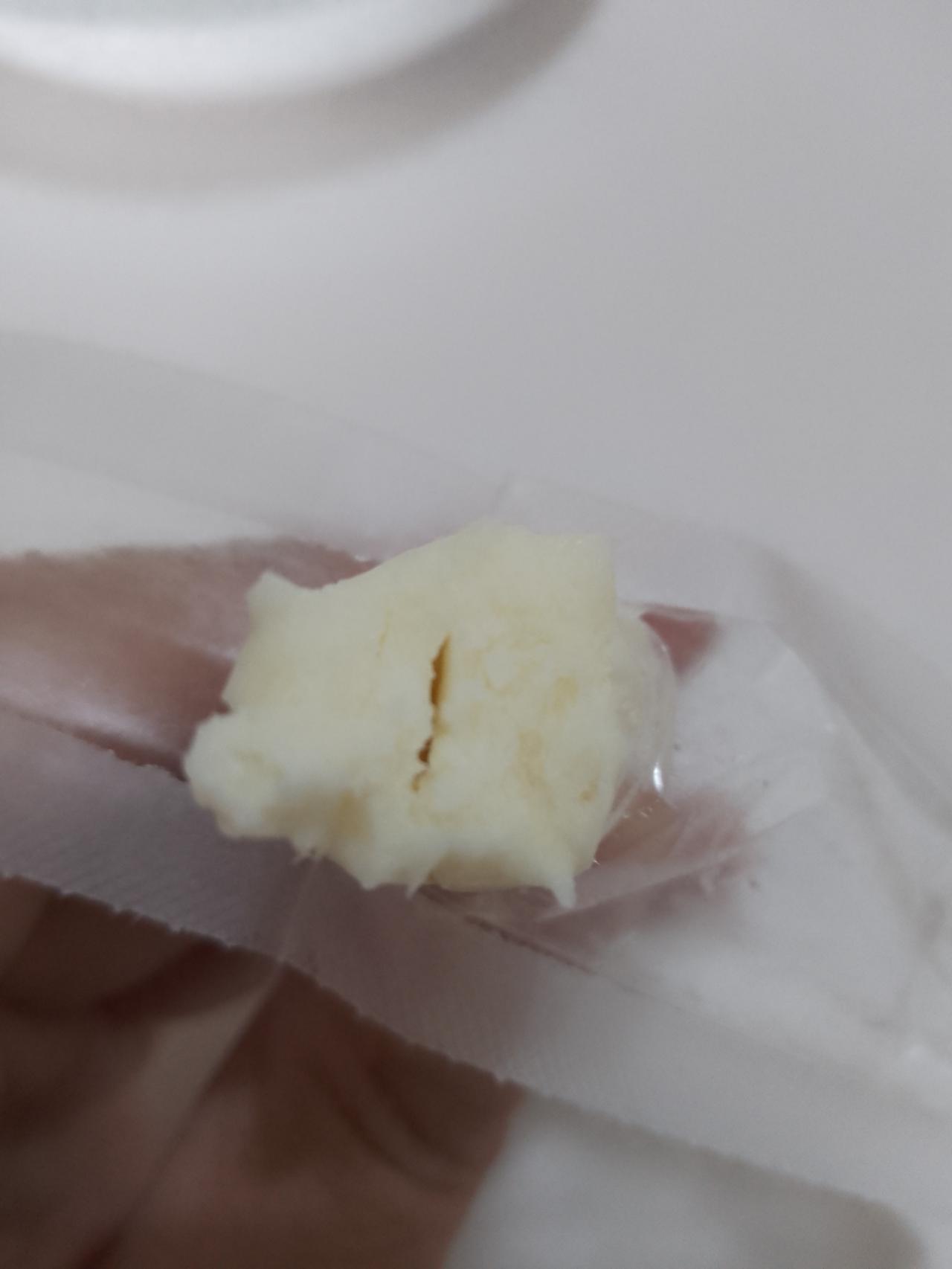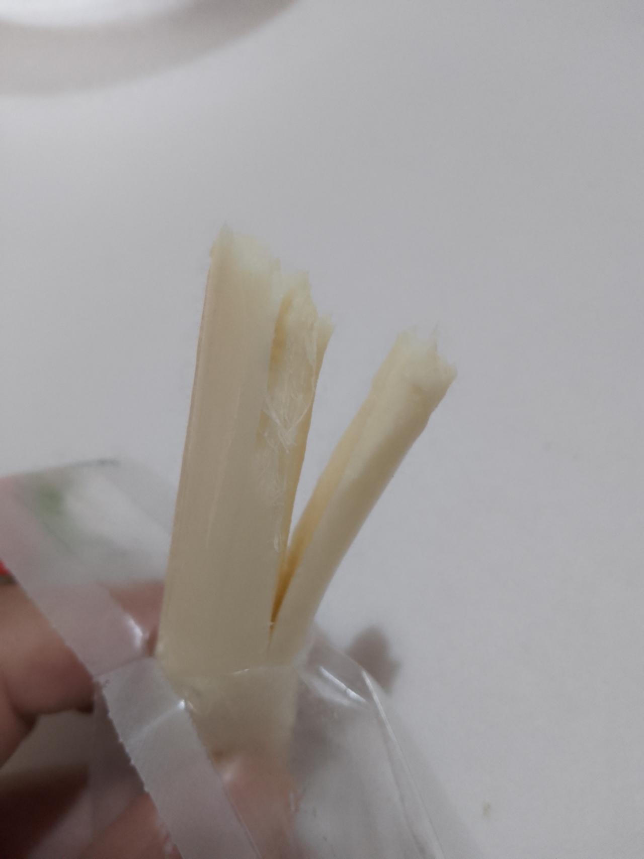 老婆大人撕开一条尝了一点就吐了,她将奶酪拍碎加鸡蛋用油煎成蛋饼、口感依然不好。