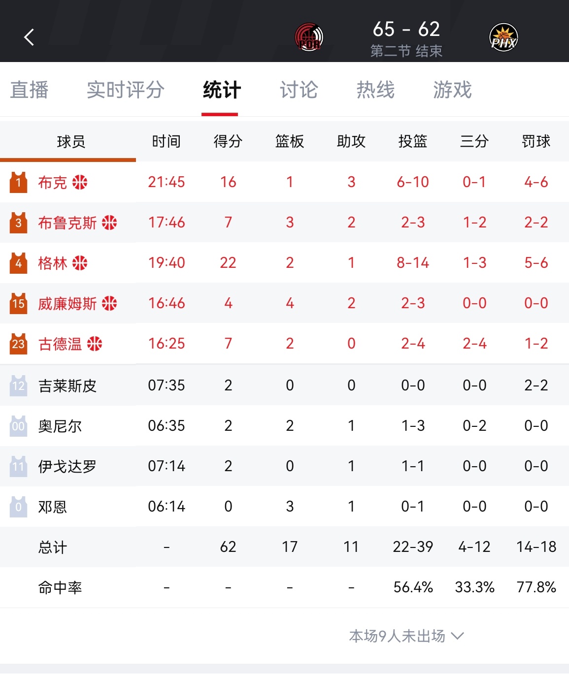 半场开拓者65-62领先太阳!