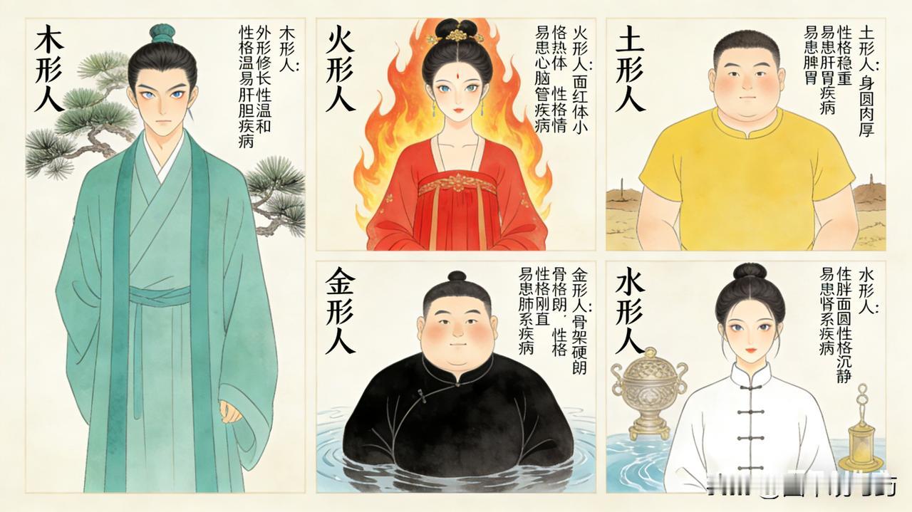 4. 金形人(如金):体形方正,骨架匀称,肤色白皙。性格:讲义气、重原则、易悲秋。易患问题:呼吸系统弱(咳嗽、哮喘)、皮肤干燥、便秘。养生核心:润肺生津,忌过度忧伤、干燥环境。