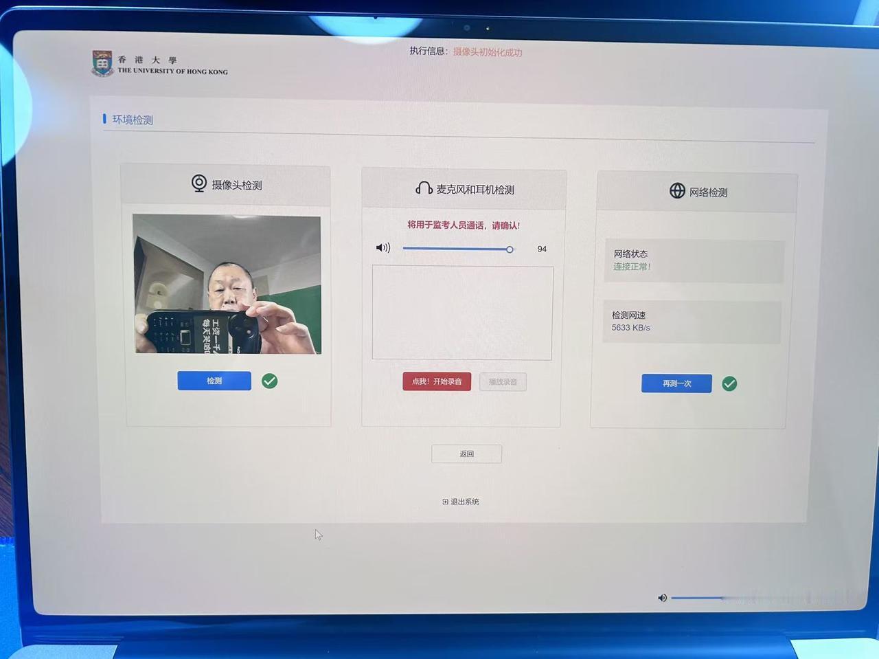 4.首先测试摄像头, 麦克风,和网速. 如图5所示.