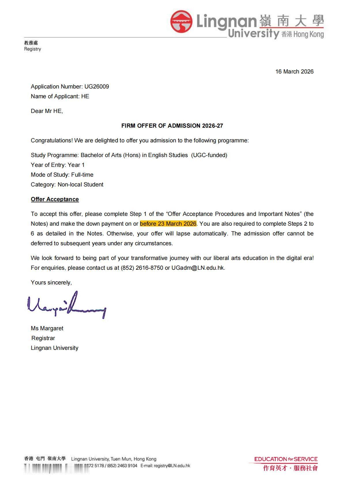 申请递交一个月以后, H同学获得了香港岭南大学面试机会,我们紧急对学生进行了面试培训, 一周后, 获得香港岭南大学正式录取, 皆大欢喜. 其他大学的offer也将继续在路上.