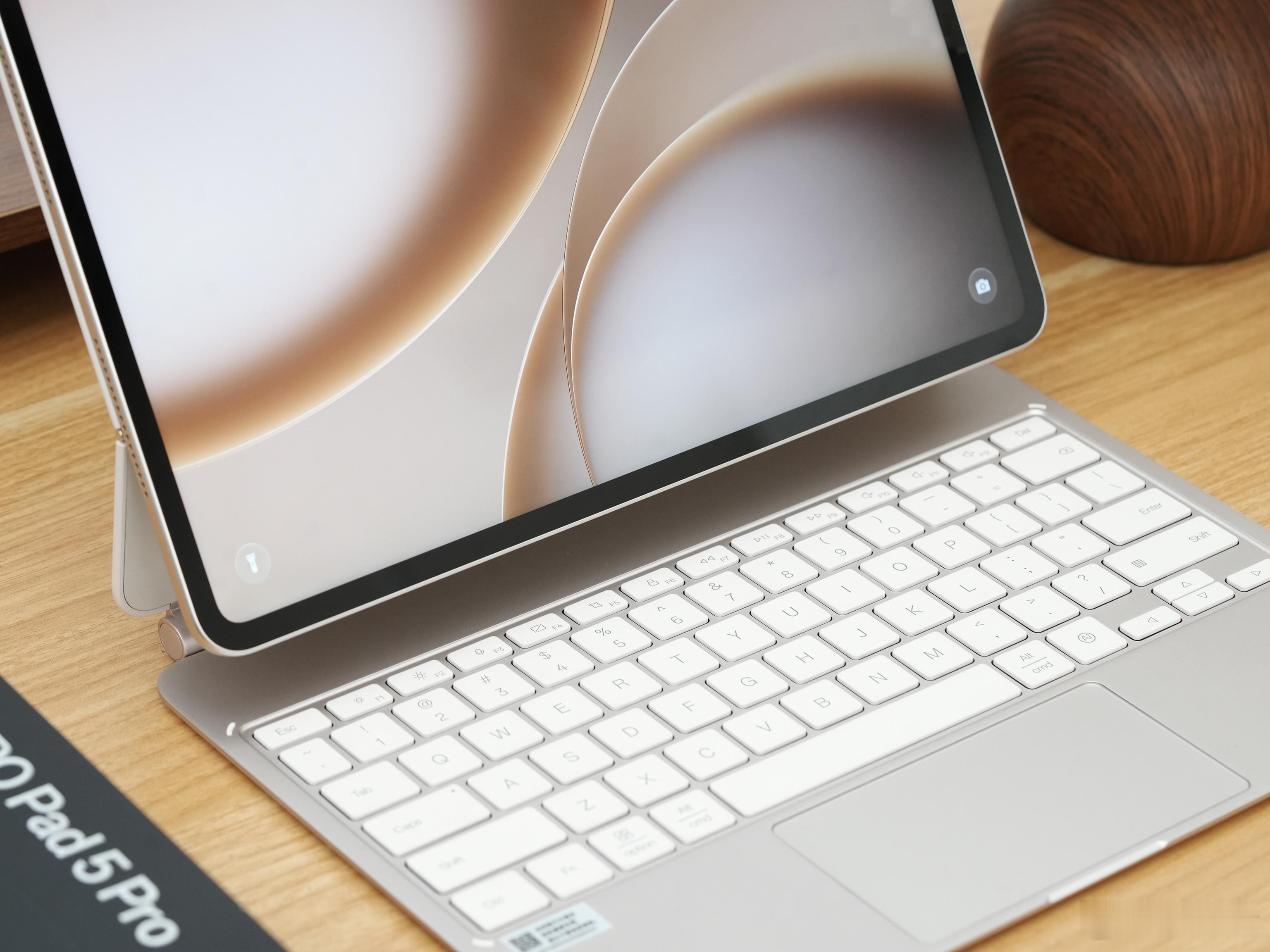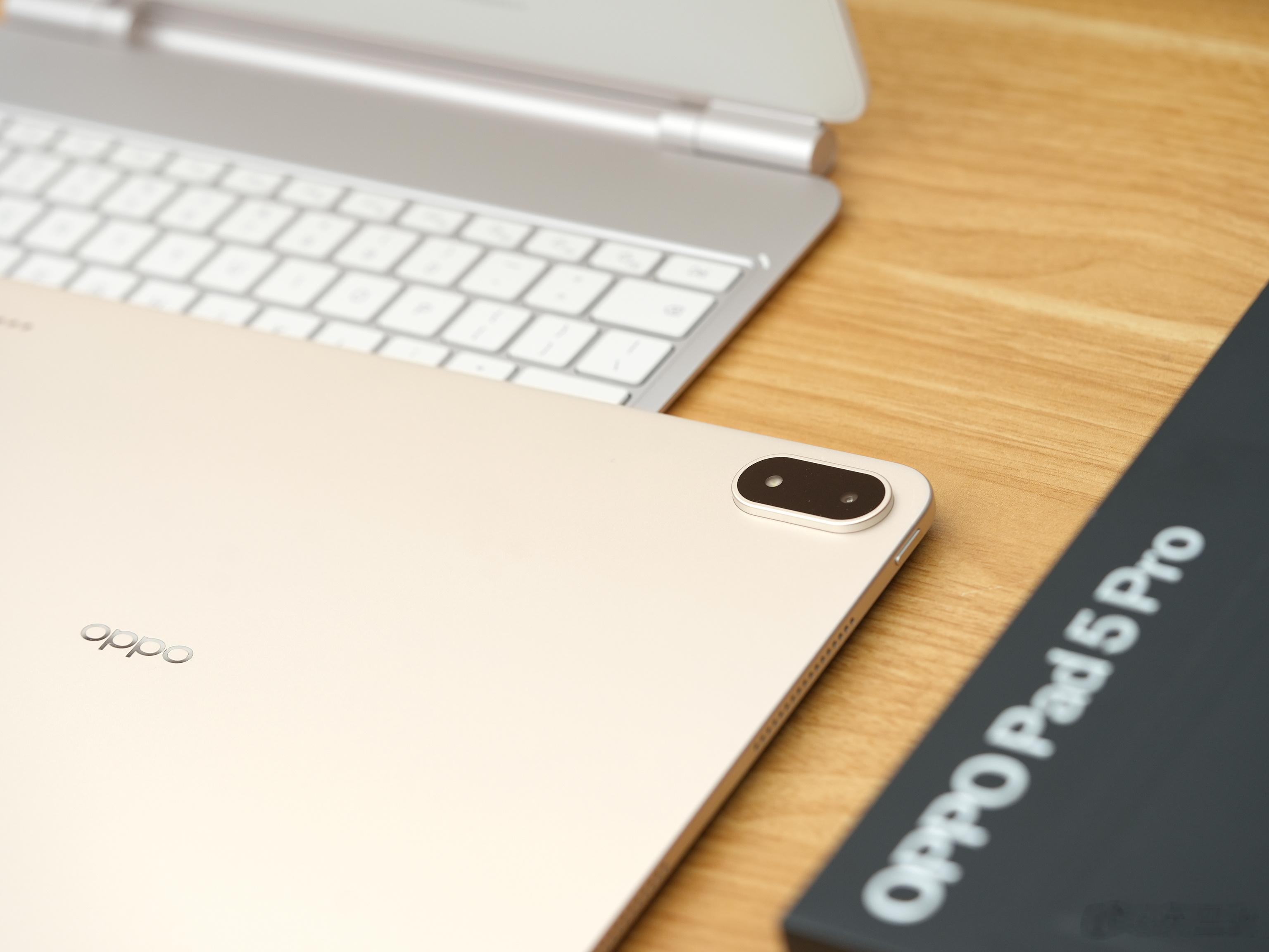 OPPO Pad 5 Pro晨曦金,淡淡的金色非常高级好看,极简风格设计,侧面看也十分轻薄。某些角度晨曦金其实特别像银色,配上键盘就是一台笔记本了