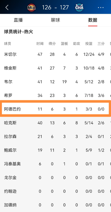 热火83分先生阿德巴约真是太可惜了!在今天热火客场以126:127输给黄蜂的比赛中,尽管阿德巴约的状态非常的出色,然而让人感到可惜的是,阿德巴约在仅仅出战了11分钟后就因伤提前退赛。