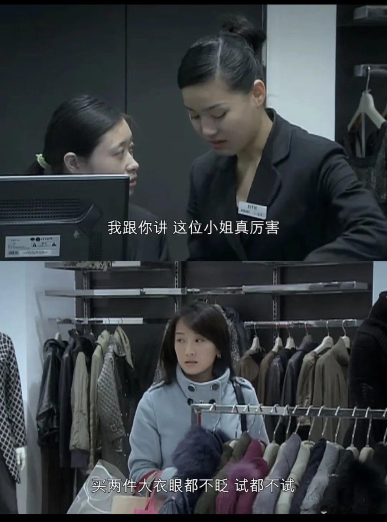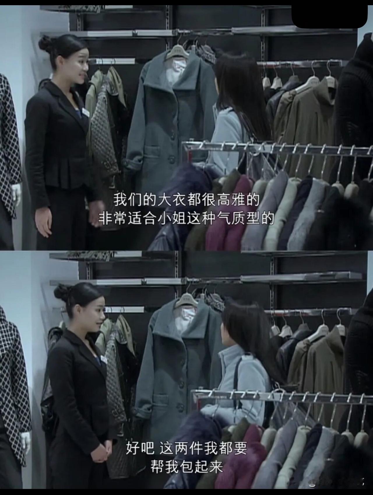 这小姐真厉害,买两件大衣眼都不眨、试都不试。