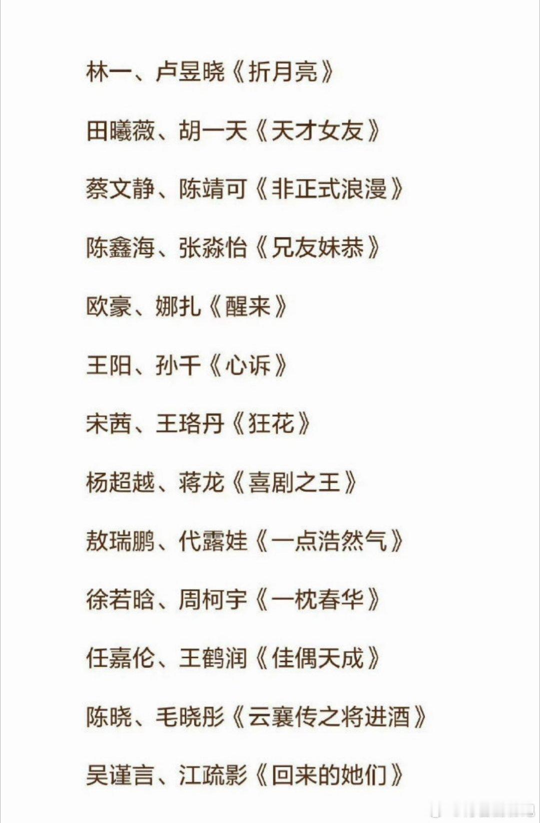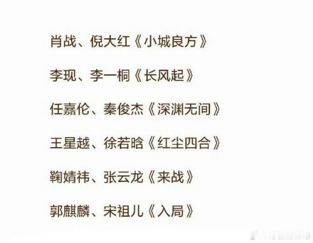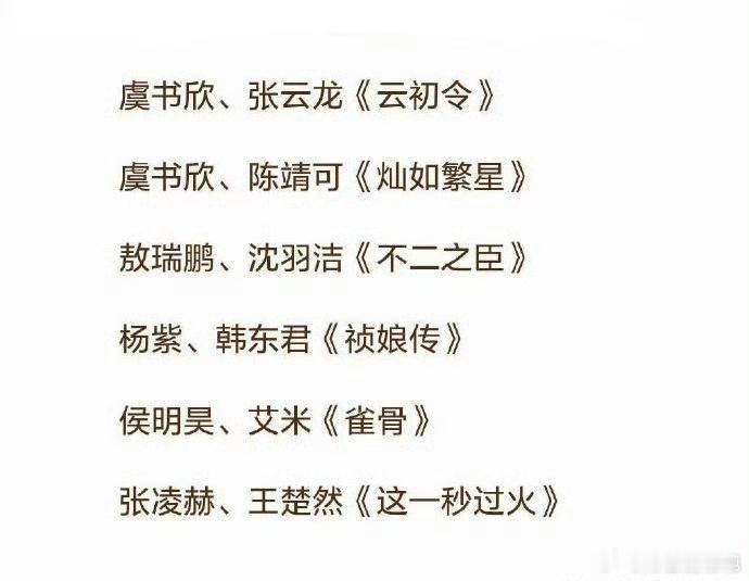 肖战、倪大红《小城良方》李现、李一桐《长风起》任嘉伦、秦俊杰《深渊无间》王星越、徐若晗《红尘四合》鞠婧祎、张云龙《来战》郭麒麟、宋祖儿《入局》虞书欣、张云龙《云初令》虞书欣、陈靖可《灿如繁星》敖瑞鹏、沈羽洁《不二之臣》杨紫、韩东君《祯娘传》侯明昊、艾米《雀骨》张凌赫、王楚然《这一秒过火》林一、卢昱晓《折月亮》田曦薇、胡一天《天才女友》蔡文静、陈靖可《非正式浪漫》陈鑫海、张淼怡《兄友妹恭》欧豪、古力娜扎《醒来》王阳、孙千《心诉》宋茜、王珞丹《狂花》杨超越、蒋龙《喜剧之王》敖瑞鹏、代露娃《一点浩然气》徐若晗、周柯宇《一枕春华》任嘉伦、王鹤润《佳偶天成》陈晓、毛晓彤《云襄传之将进酒》吴谨言、江疏影《回来的她们》王星越、王源《暴虎》陈晓、张新成《秦谜》秦昊、汤唯《孔雀东南飞》刘昊然、李兰迪《海岛舒服日志》迪丽热巴、陈昊森《虽然不能同时拥有一切》钟楚曦、陈伟霆《爱情慢慢》李兰迪、郭俊辰《喀什恋歌》吴宣仪、翟潇闻《有戏》孙俪、孙阳《生日将至》赵又廷、庄达菲《生而有翼》潘粤明、胡先煦《寻找李顺章》周冬雨、彭冠英《海边的秘密》王骁、田曦薇《擒贼记》