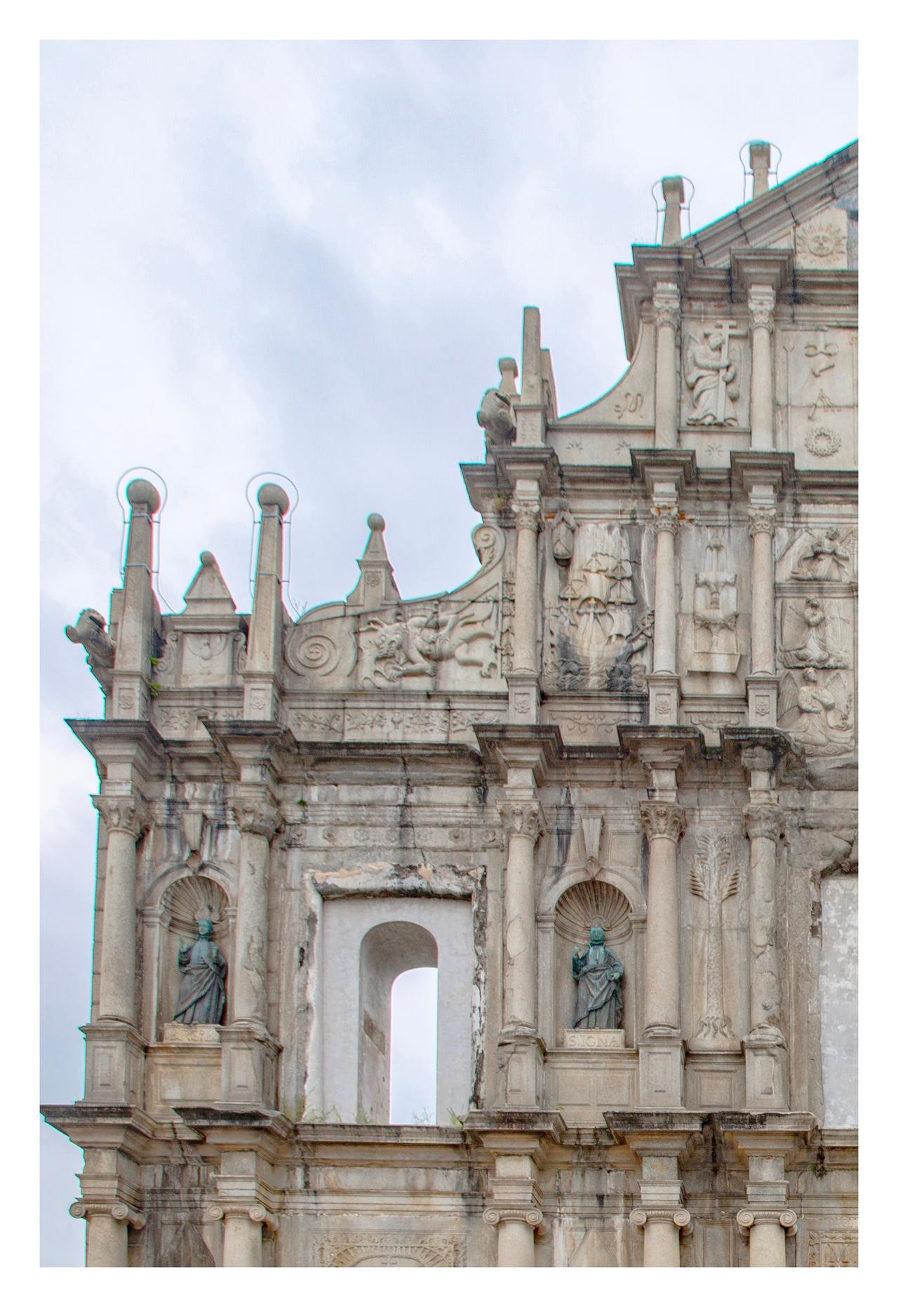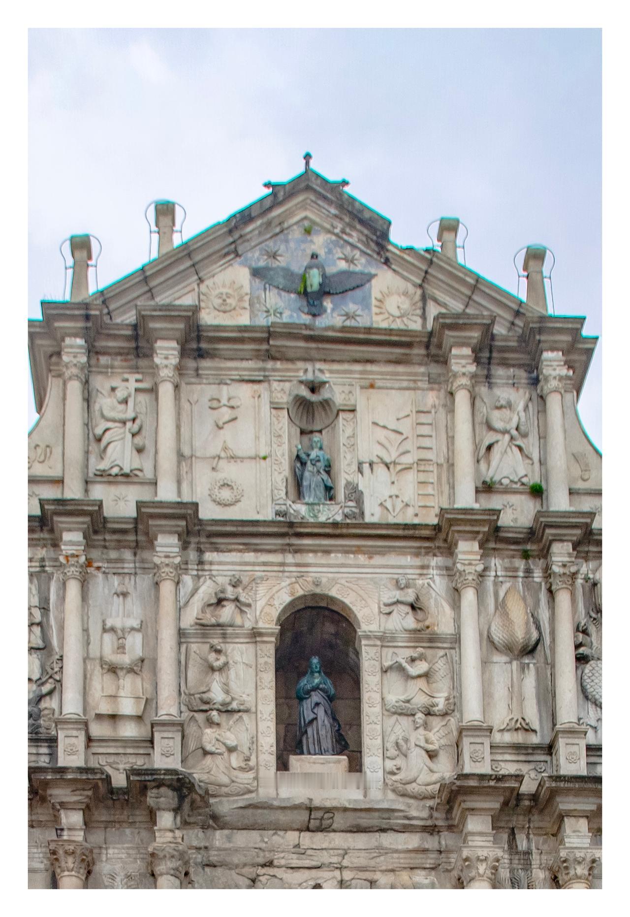 大三巴旅游 大三巴牌坊总共有五层,主要以花岗岩建成,宽23米,高25.5米,坊前有68级石阶,三至五层渐收构成一底边宽为8.5米的三角形山花。建筑设计采用意大利巴洛克风格,而其中雕刻又具有东方特色,牌坊上嵌有耶稣会圣徒、圣母像、天使浮雕以及耶稣圣龛等雕刻,也有石狮、汉字以及日本的菊花雕刻等东方元素,它融合了东西方建筑艺术的精华,是一个中西文化交融的艺术品,又称“立体的圣经”,具有很高的文物价值和艺术价值,长期受到中外建筑人士的高度评价。