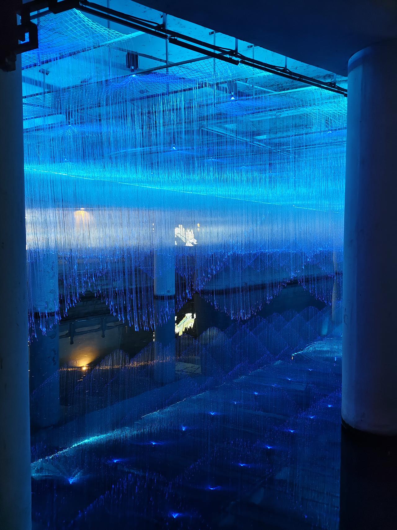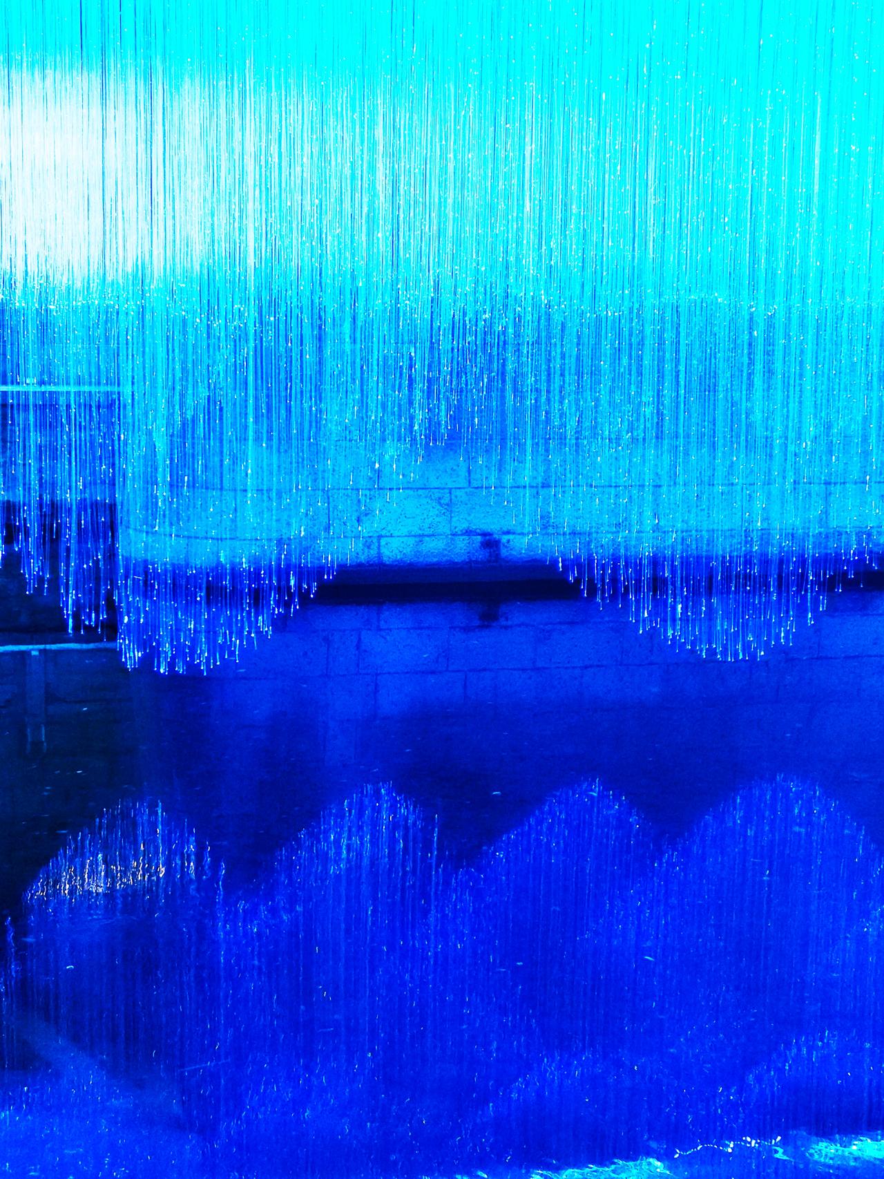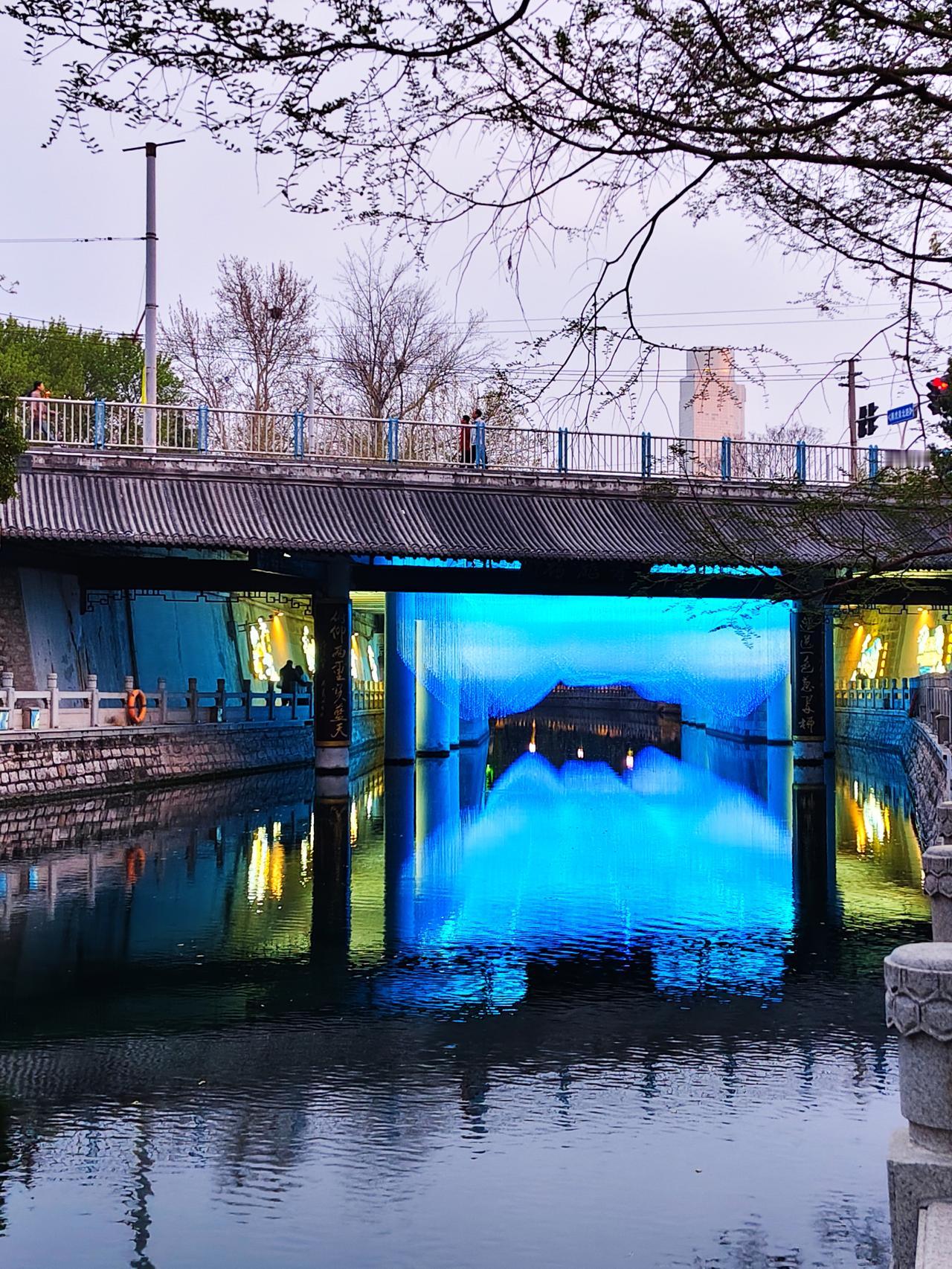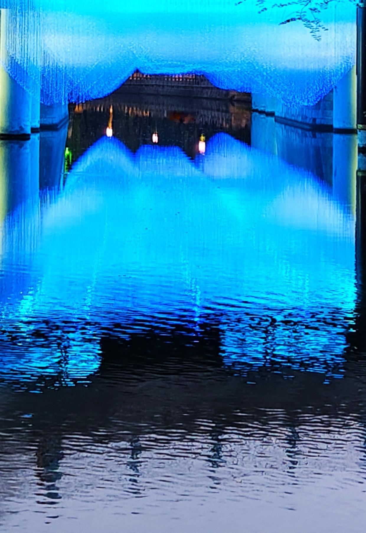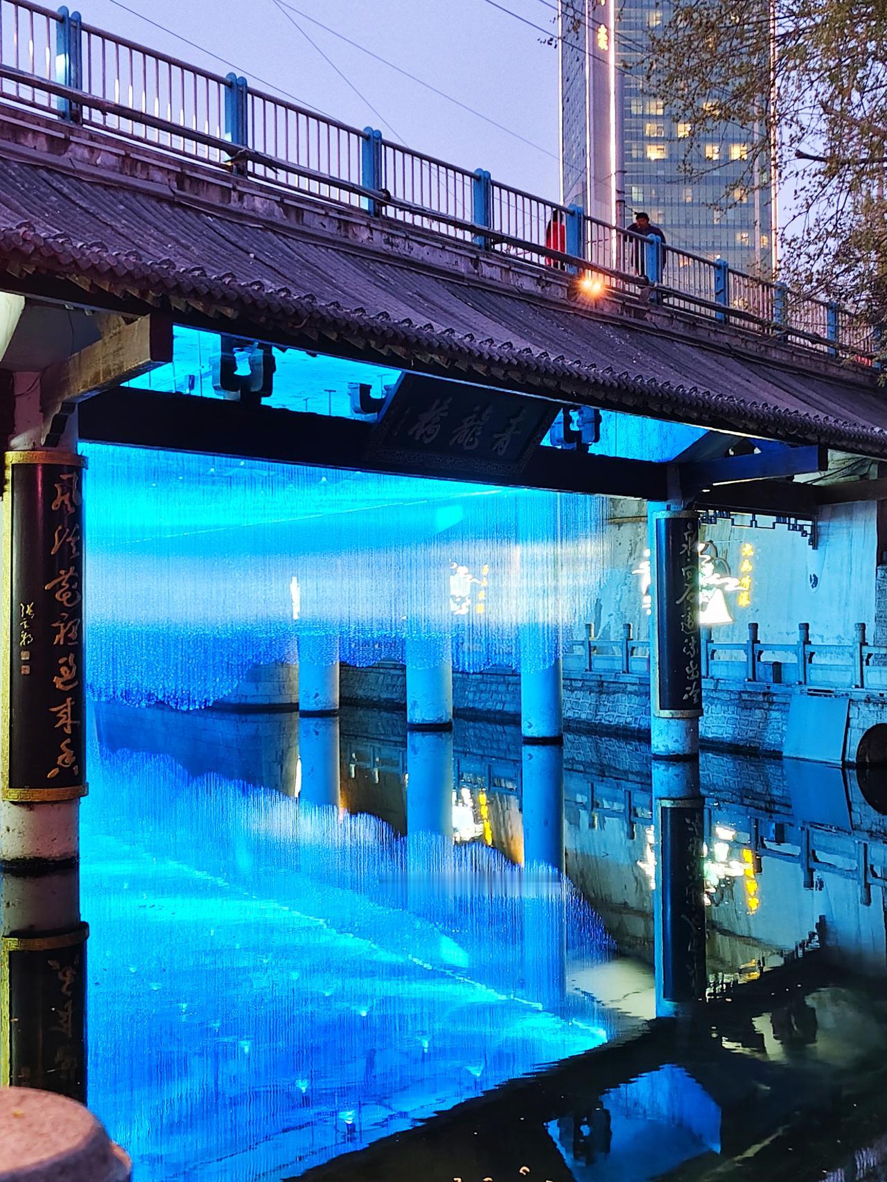天渐渐黑了下来,走着走着猛然间,看到远处的青龙桥如蓝色瀑布低垂桥下,慢慢走近一看像极了繁星点点缀满桥顶,与涓涓泉水的波光交相辉映,营造出了如梦如幻的氛围。