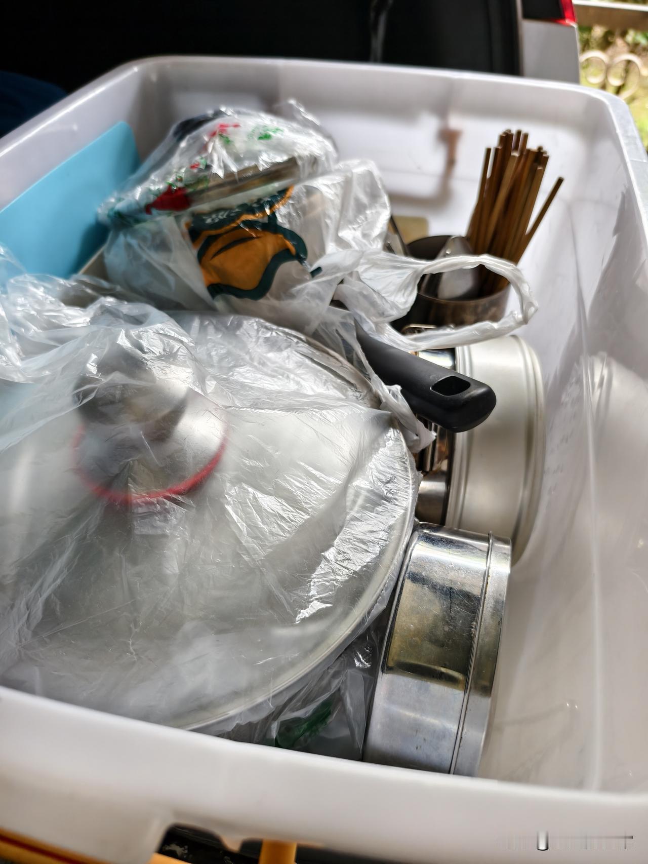 大盒子里放炒锅、电饭煲、电水壶、碗、切菜板等。