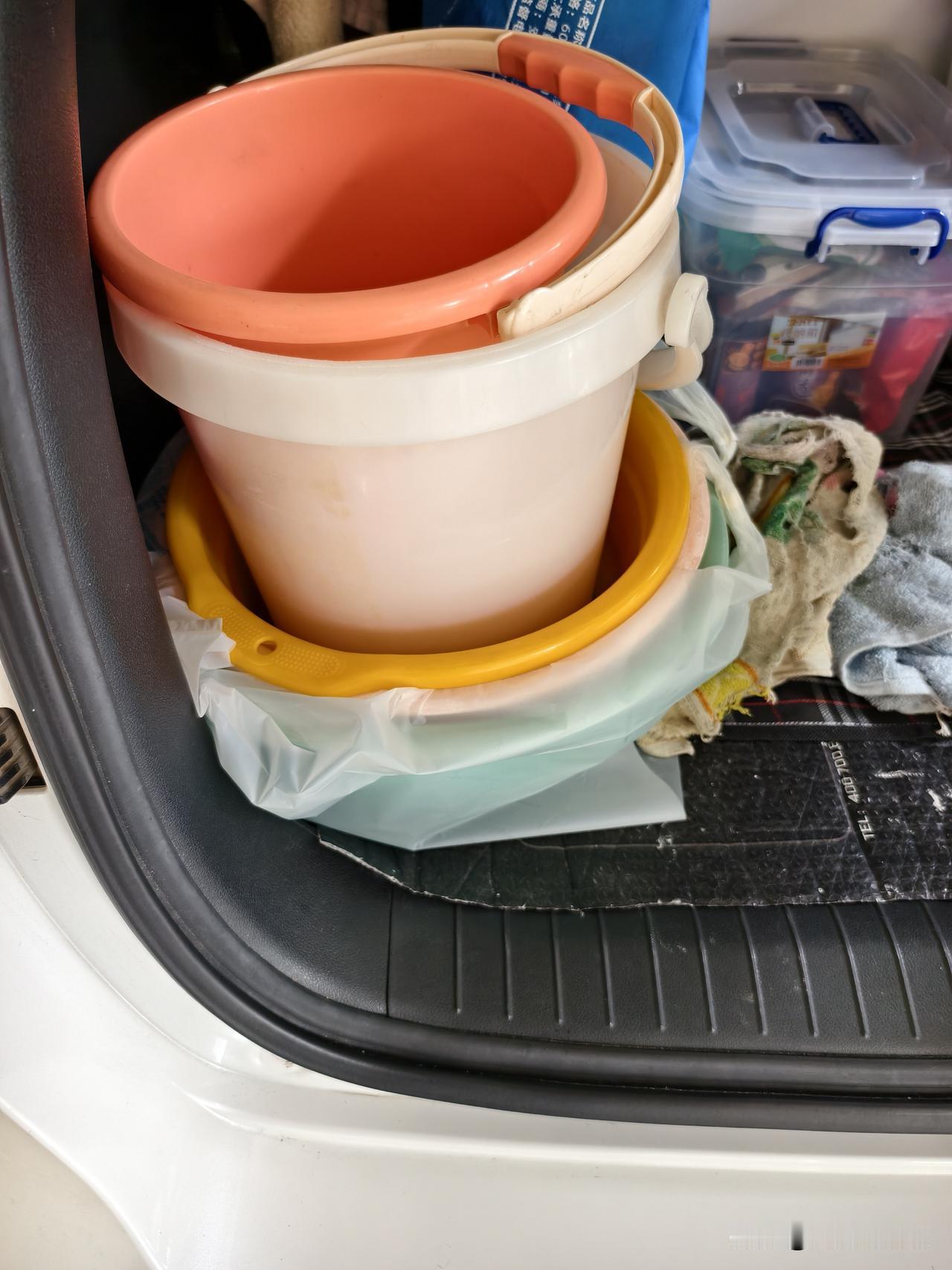 至于洗菜盆、洗脸和洗脚盆(各二套)、大小水桶,重叠放在一起。开水壶可以放在小桶里,就行了。