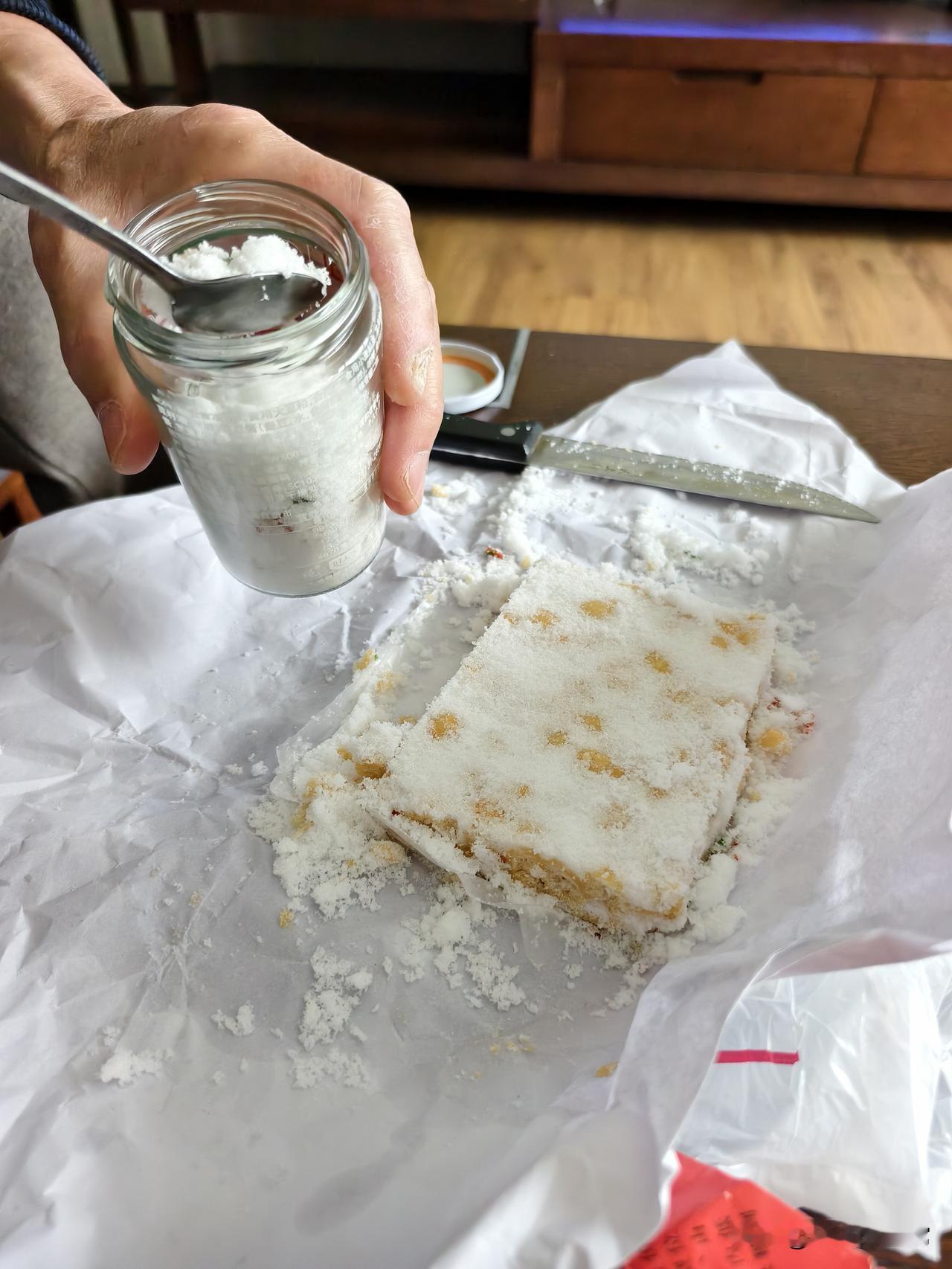 看看这点心有多少绵白糖 这泡子糕实在太甜,老伴就把上面的绵白糖,用水果刀刮下来