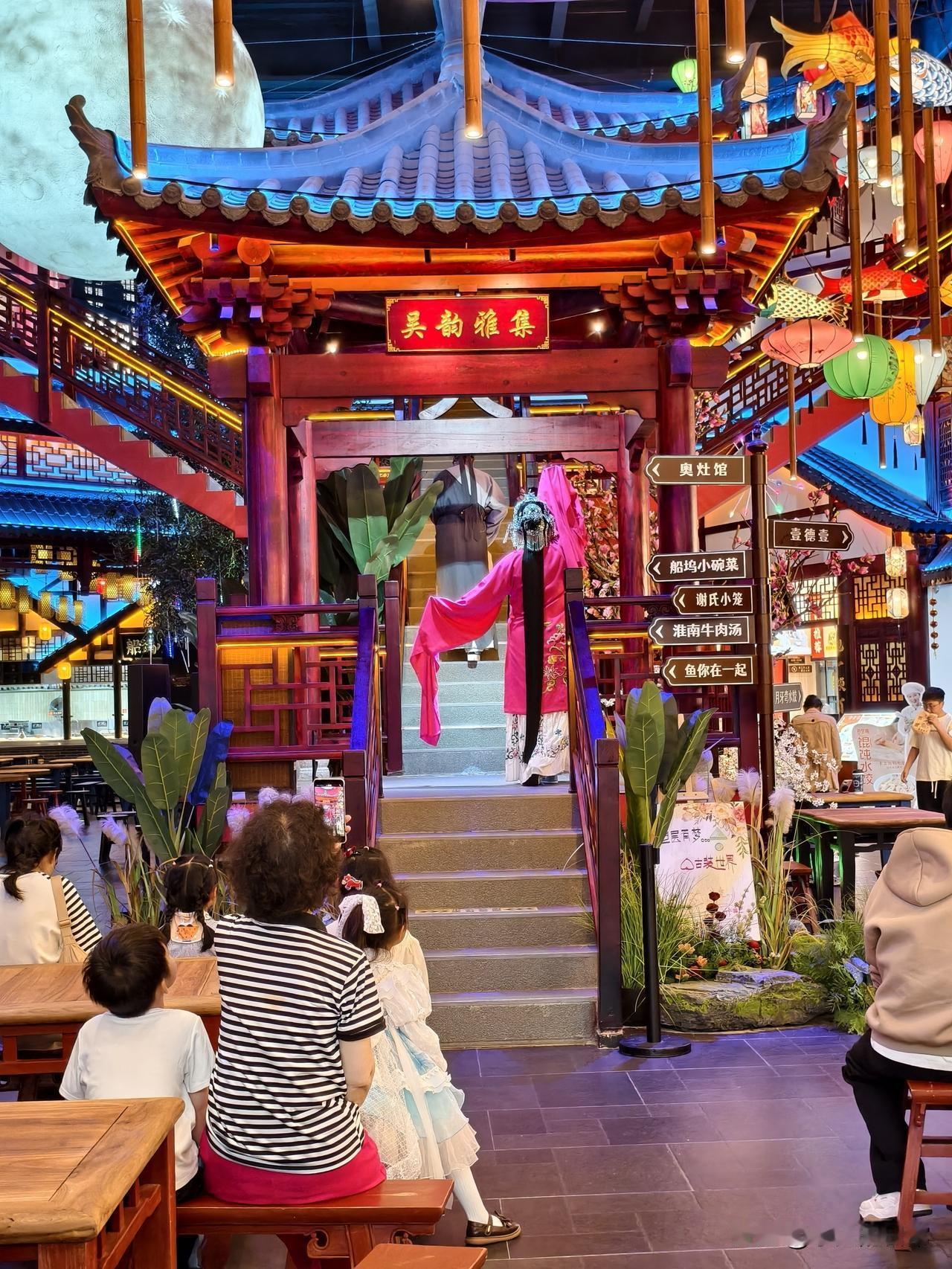 服务区内部有唐宋风格美食街、亭台廊榭,有