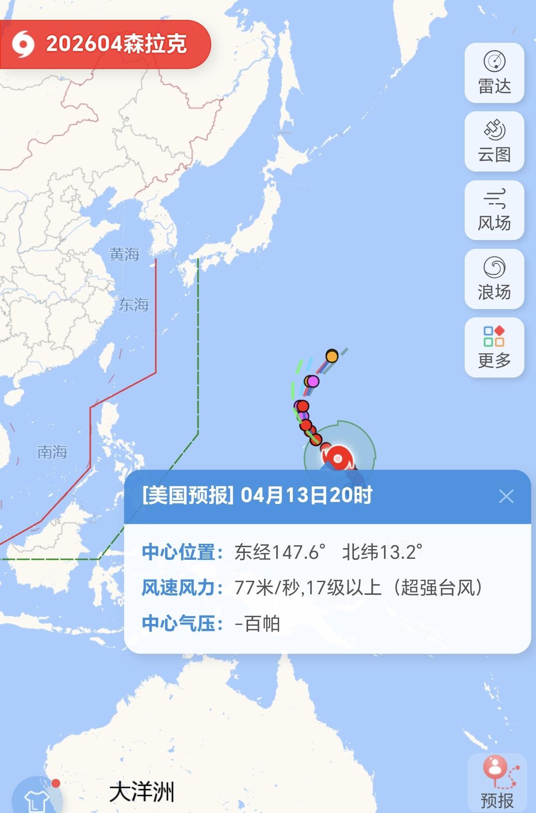 4月13日08时,今年4号台风“森拉克”距离美国关岛470公里,目前移动速度为15-20公里/小时。