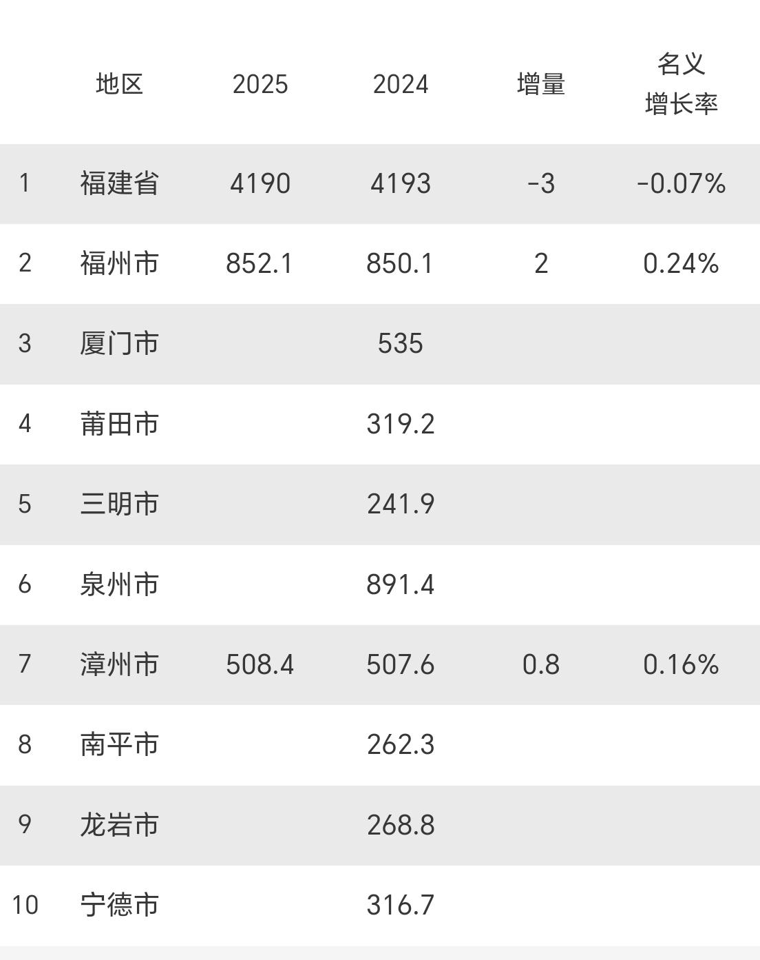 2025年末,福建省全省总常住人口减少3万人,目前排名全省常住人口第二位的福州,第四位的漳州,都实现了正增长。