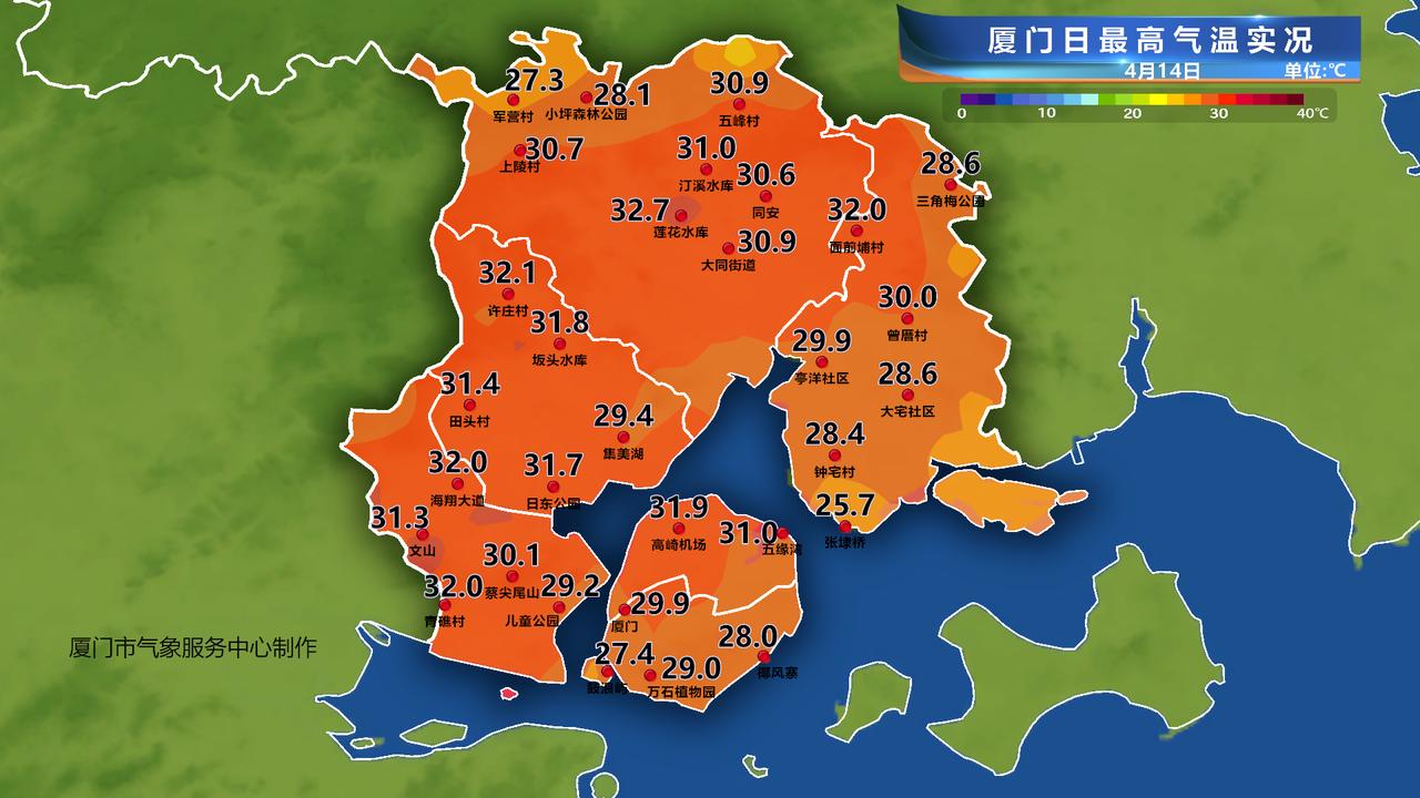 受到暖湿气流影响,今天厦门气温较高,东渡本站最高温29.9℃,最低温22.2℃,岛外多个站点最高温超过32.0℃。