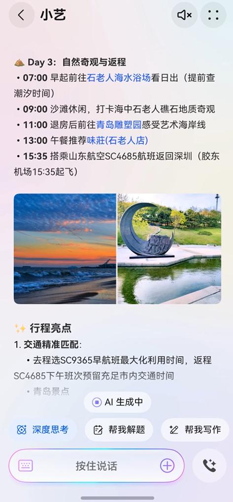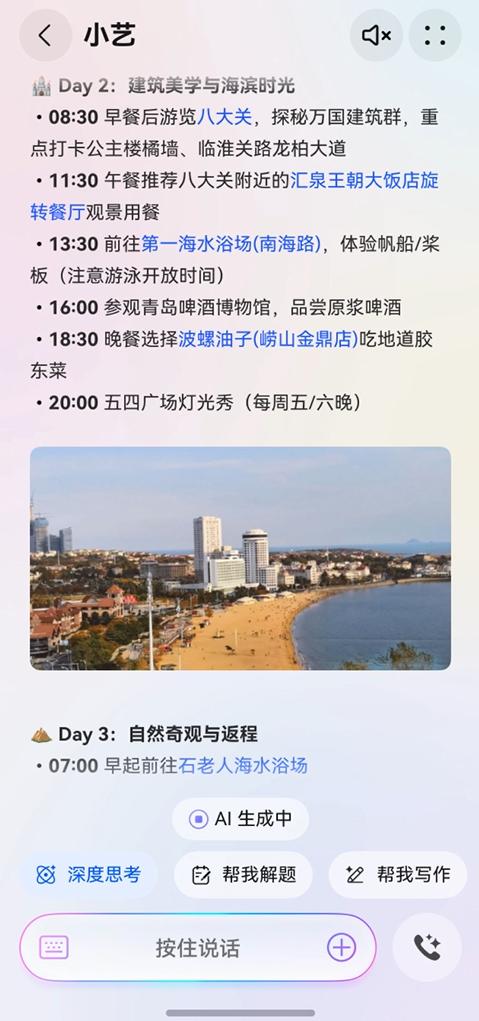 三天下来,我们逛了八大关景区,吃了海鲜大餐,在第二海水浴场戏水踏浪,还看了信号山公园的落日。整个行程轻松又惬意,全靠小艺帮忙,真的太靠谱了!