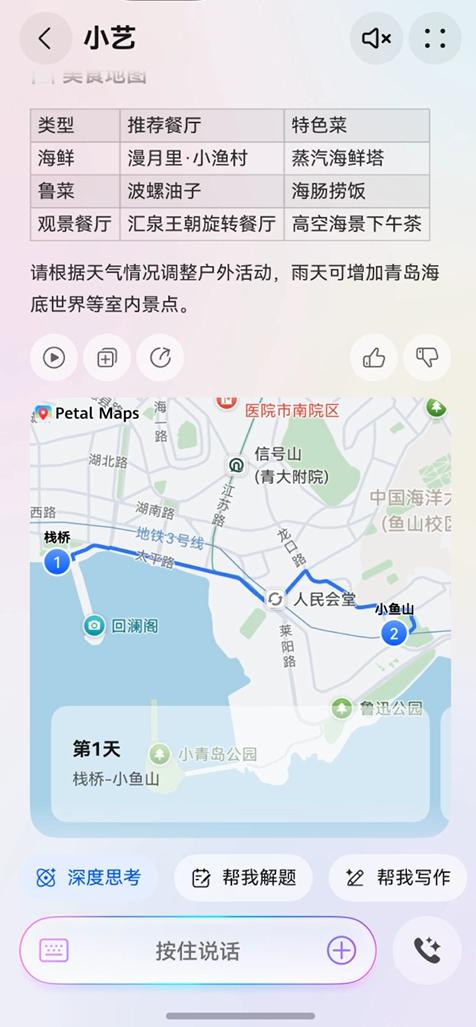 第一天去青岛海滨初体验,第二天感受建筑美学和海滨时光,第三天看看自然奇观再返程。一路上,遇到不认识的花花草草或者海洋生物,我直接拍照拖给小艺,小艺马上就能给出精准答案,就像随身带着一个“万事通”。就算遇到复杂问题,小艺也能“一句话问清所有事”,超强理解能力真的让我很惊叹。