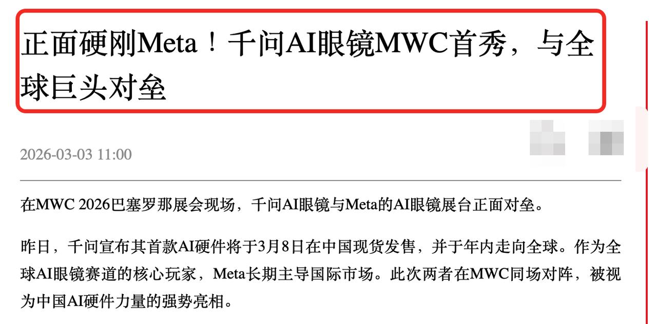 3月2日世界移动通信大会在巴塞罗那召开,在会上,中国第一AI眼镜品牌千问AI眼镜首次亮相世界舞台并且还和美国第一AI眼镜品牌Meta杠上了!。