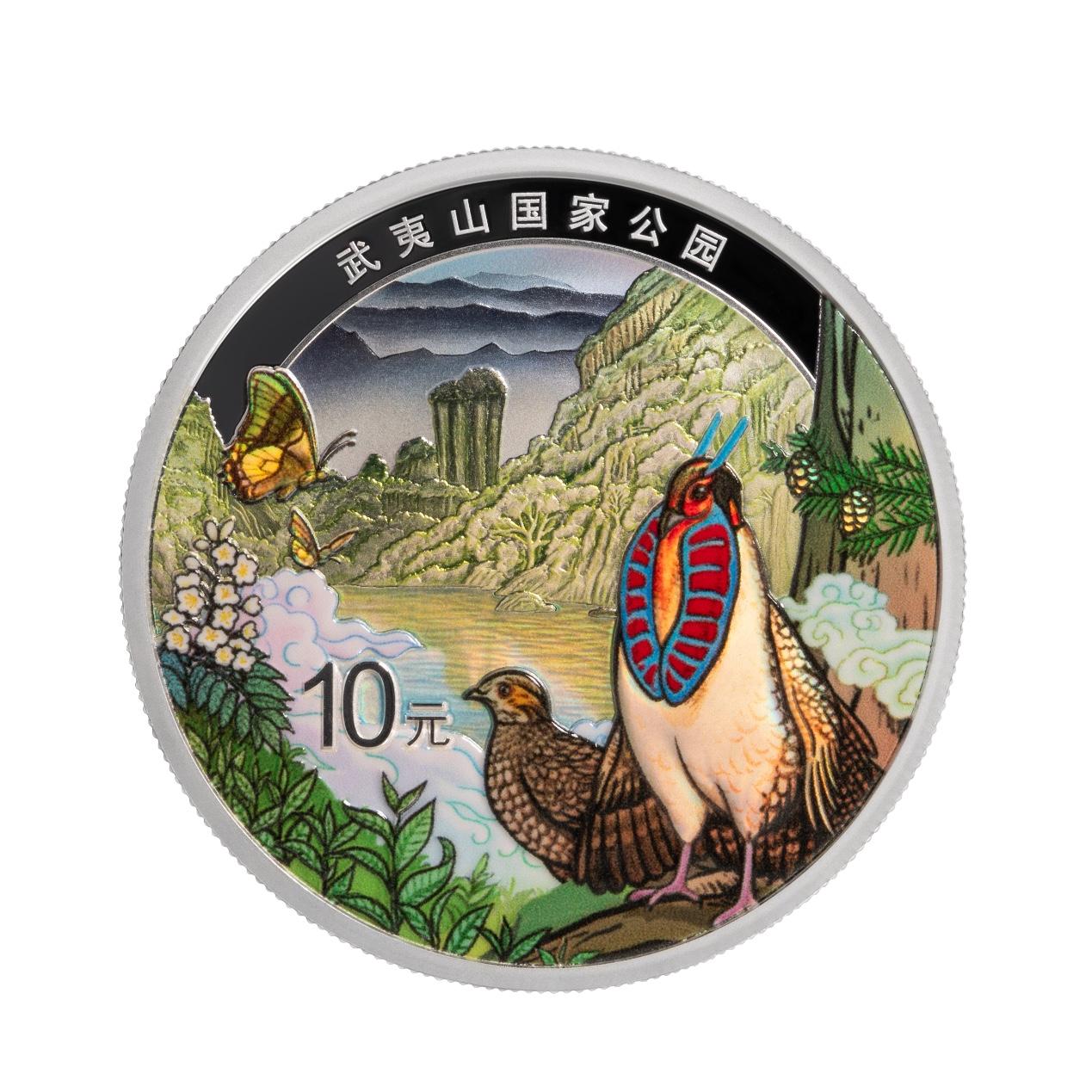 3克金质纪念币背面,栩栩如生地还原了玉女峰的亭亭玉立,山下九曲溪水潺潺,一叶竹筏悠然划过,正是“九曲泛舟”的经典场景,仿佛能听见溪水潺潺,感受武夷山水的温婉与灵动;30克银质纪念币上,黄腹角雉、金斑喙凤蝶、南方铁杉等珍稀物种清晰可见,这些都是你在武夷山国家公园可能邂逅的生灵,是自然馈赠的惊喜。