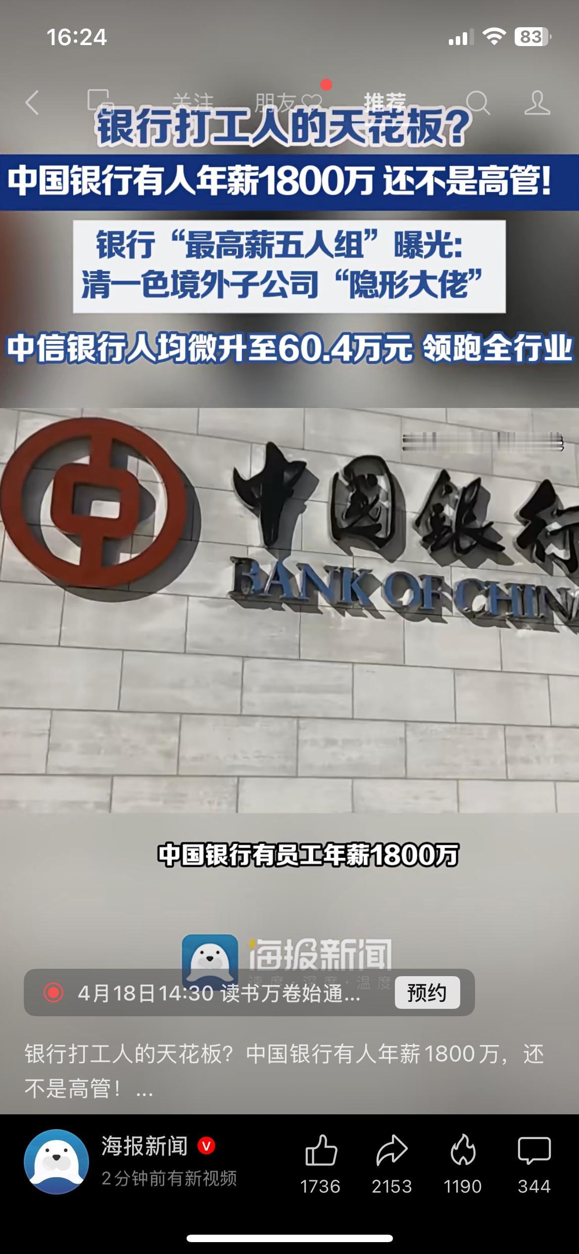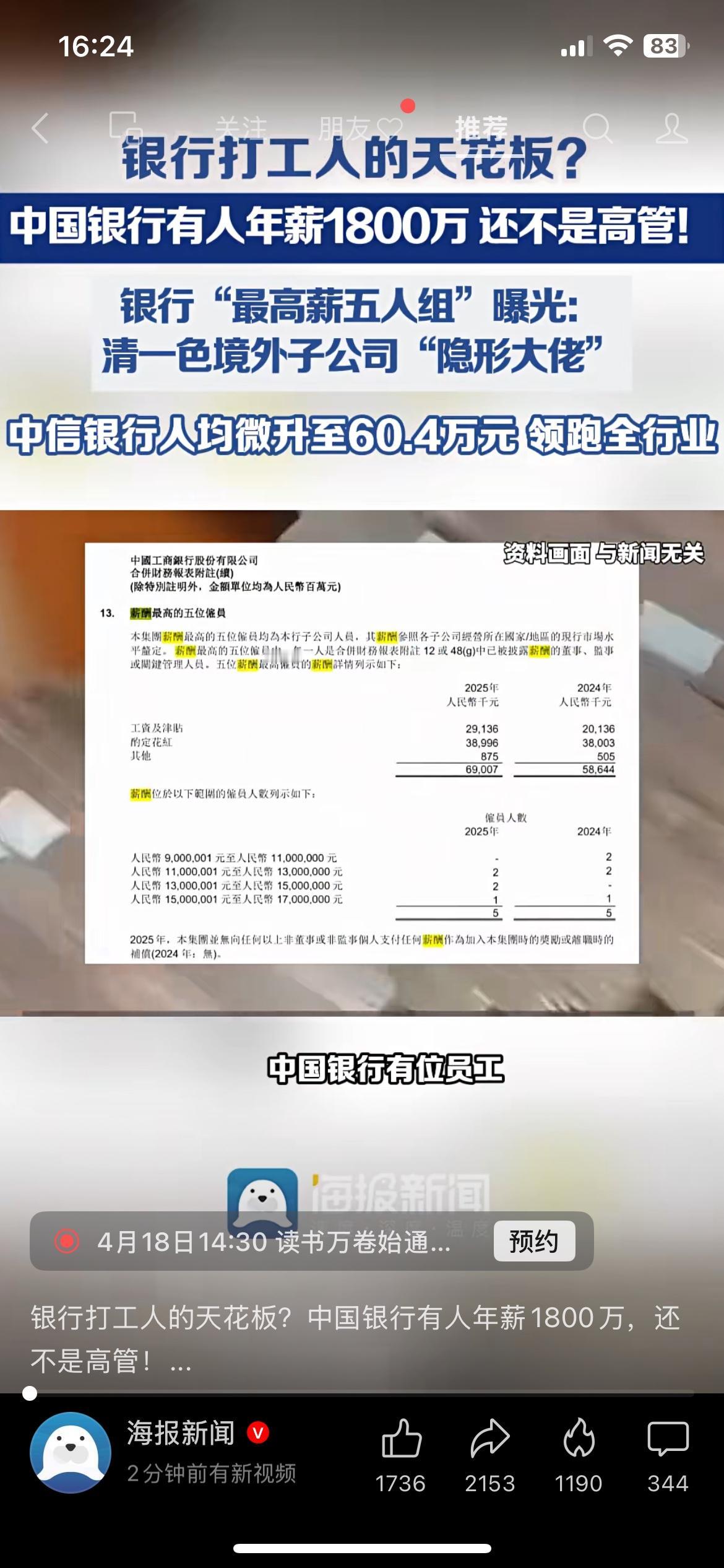 中国银行有人年薪1800万,还不是高管! 银行行业的薪资差距真的很明显,中国银行