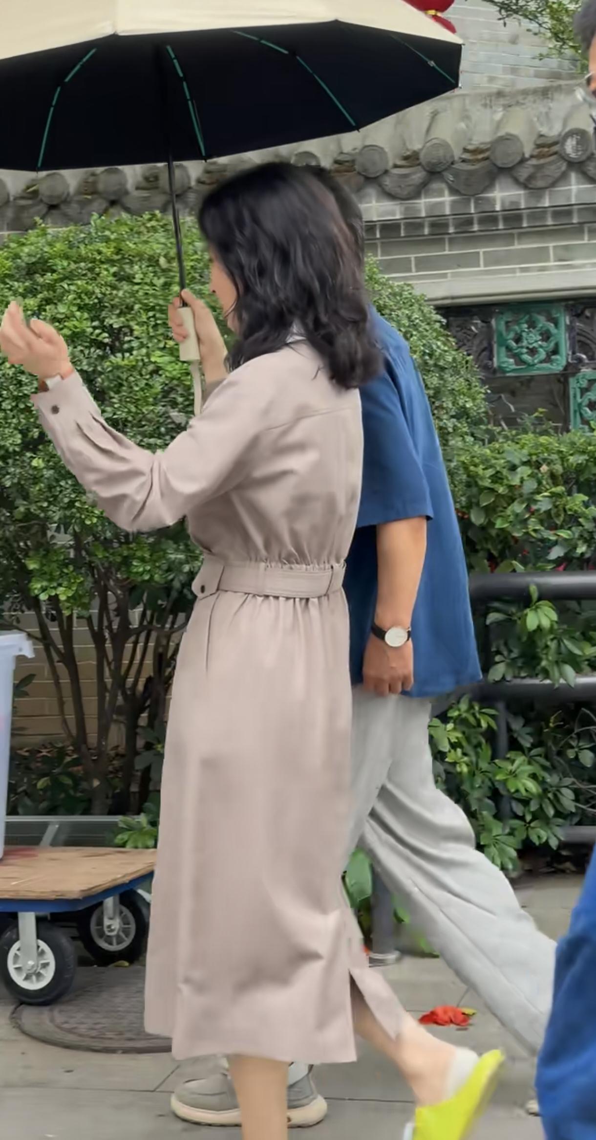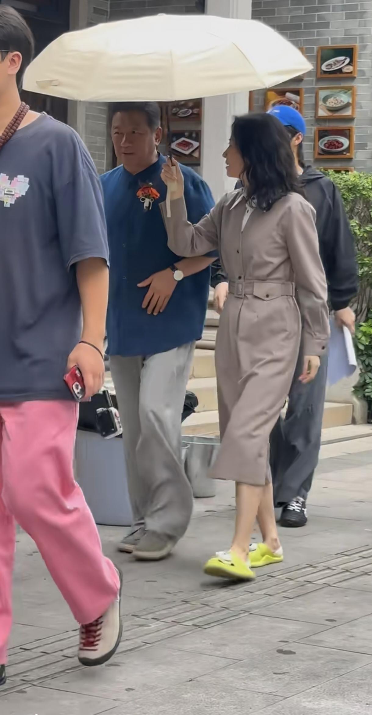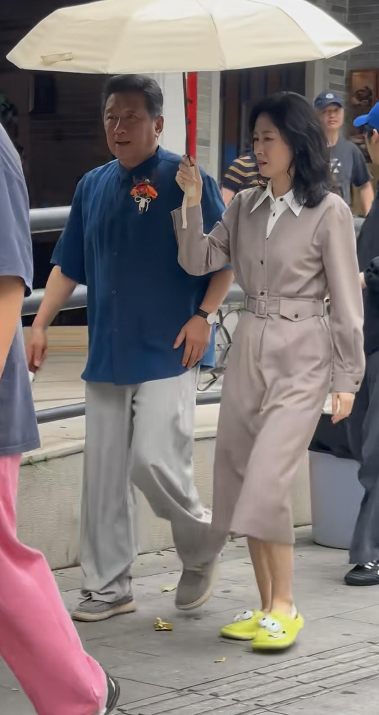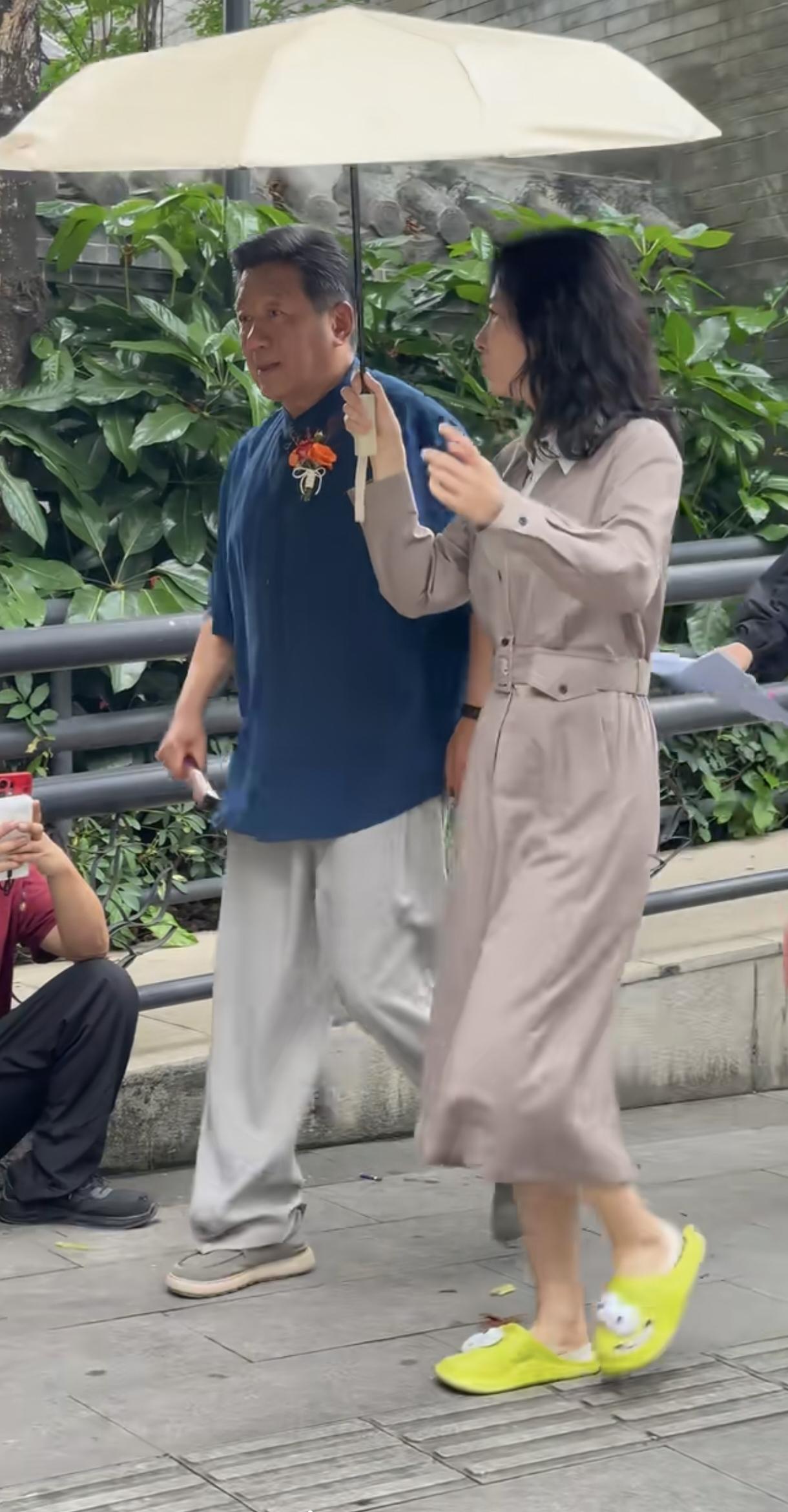 刘敏涛裙子好漂亮,拖鞋怪可爱的。丁勇岱是前辈加长辈啊,刘敏涛给他打很正常啊。两位都是实力派演员。