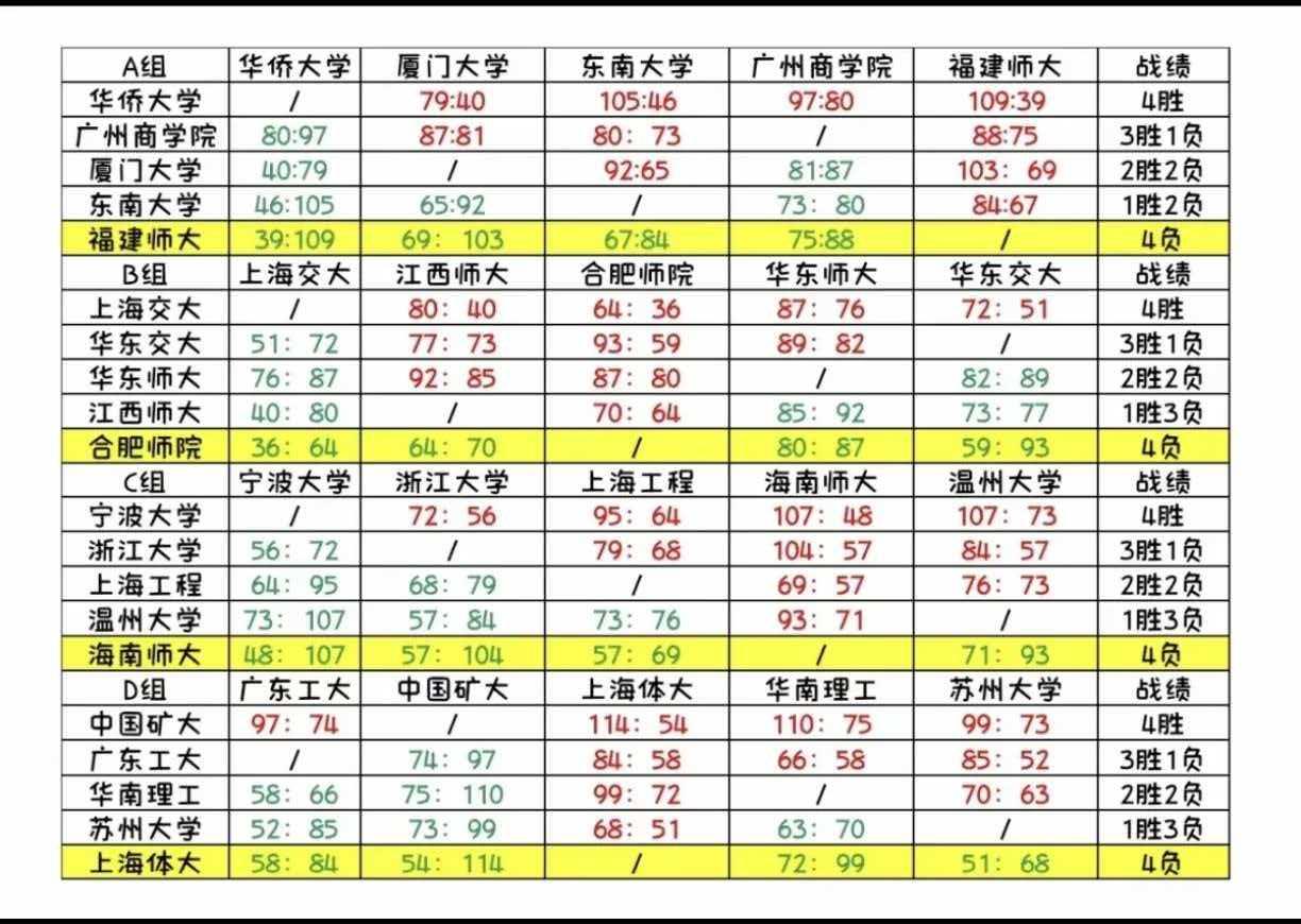 福师大,合肥师院,海南师大,上海体大,四战全败被淘汰了。