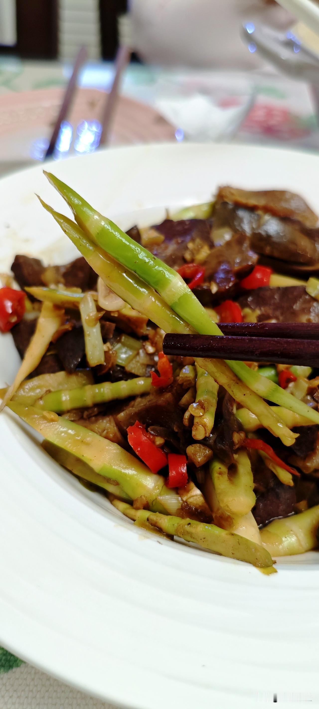 孩子外地上学了,我和老婆下班健完身回来有点晚,我就炒了两个菜:猪肺炒笋尖、清炒西