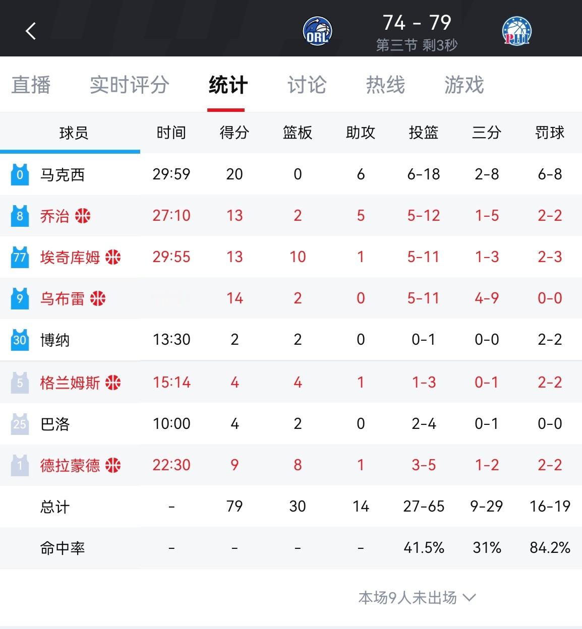 三节结束,魔术74-79落后76人。