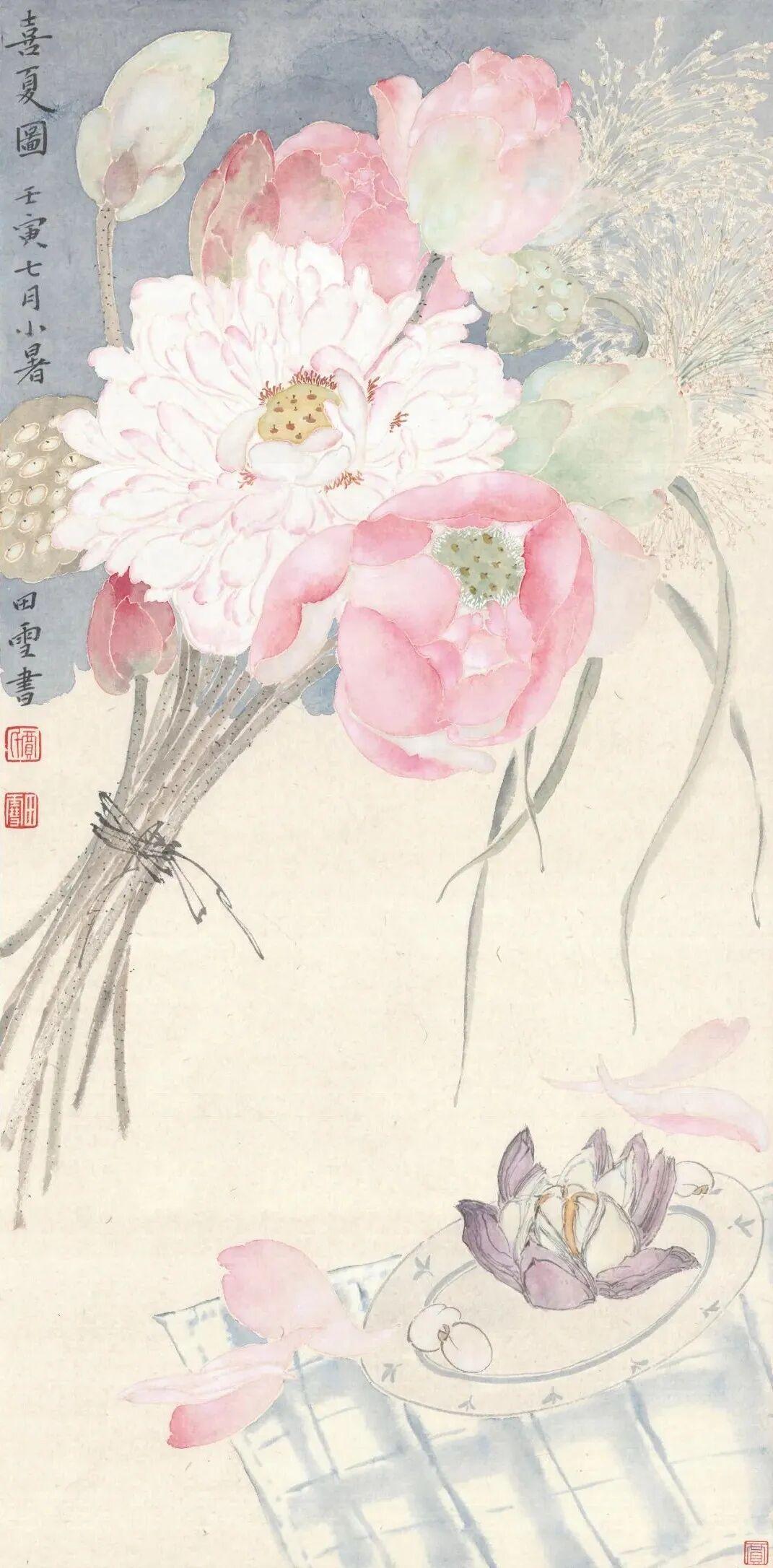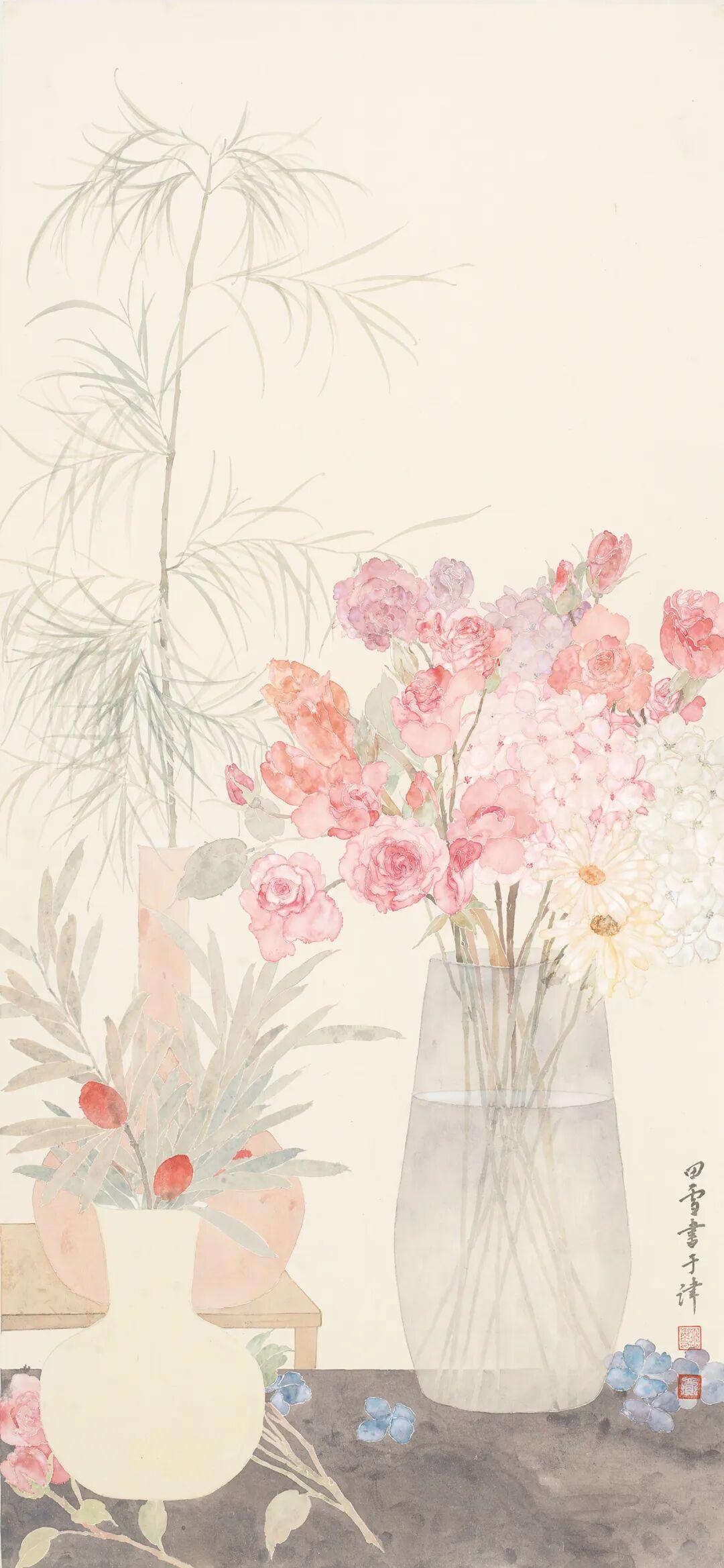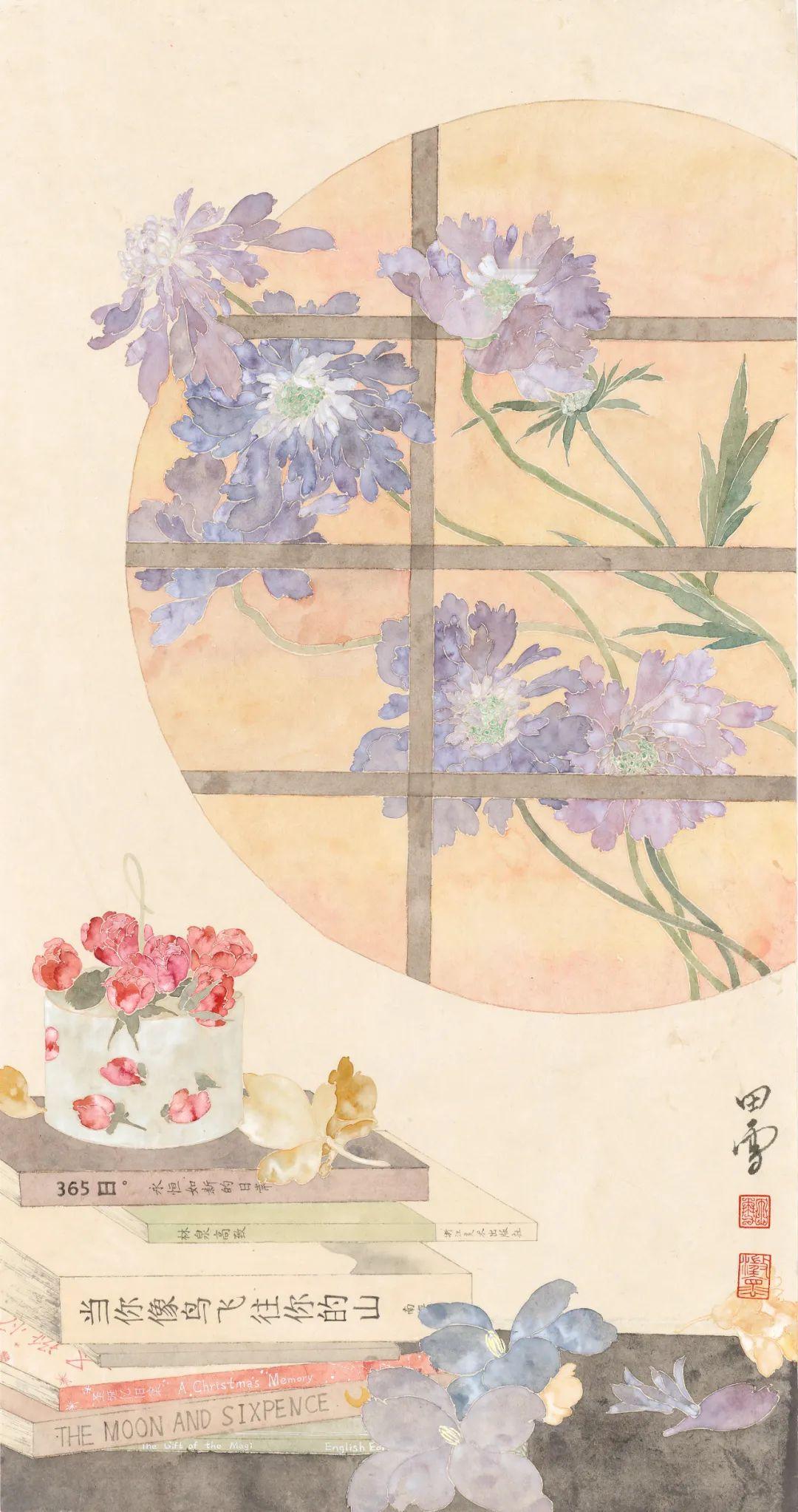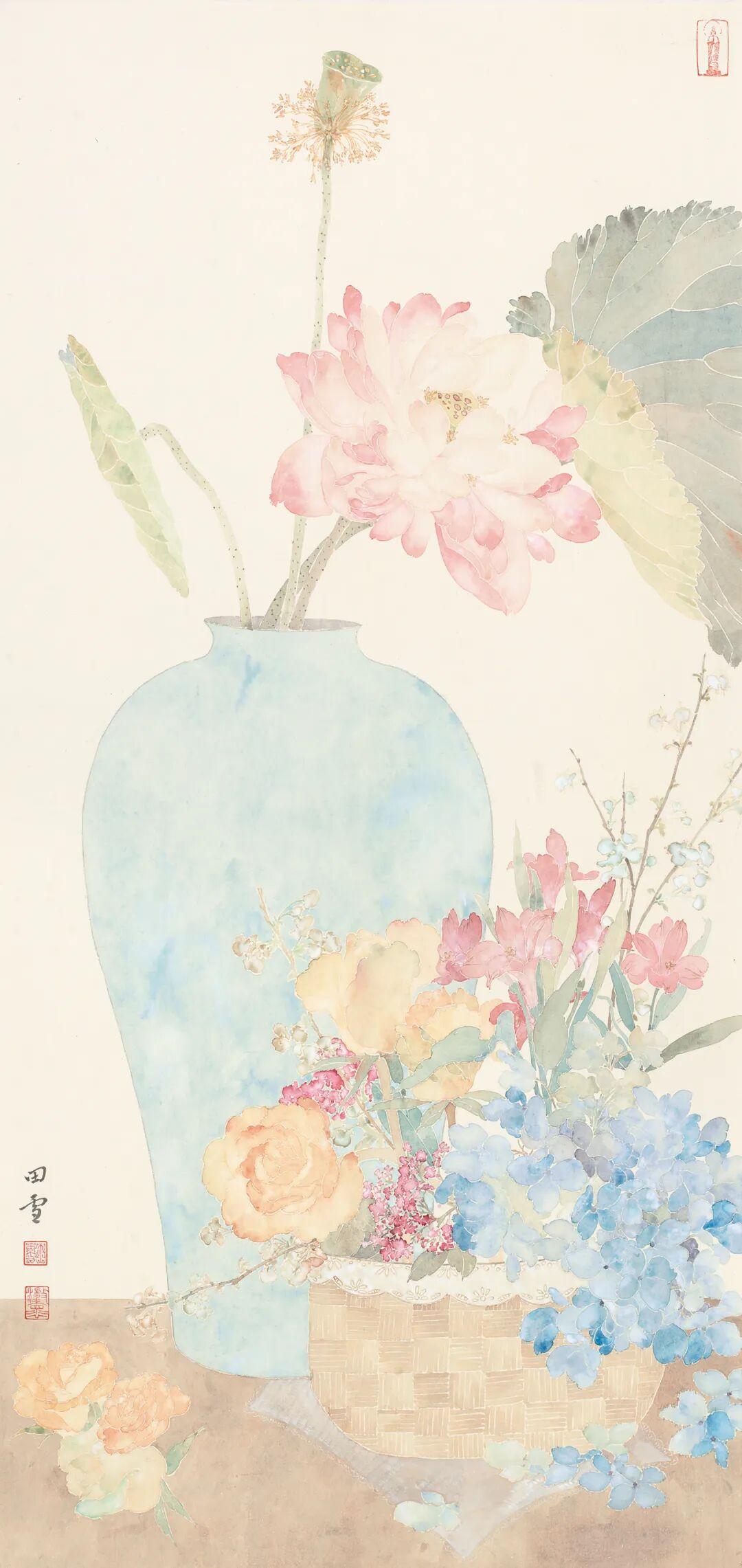 贾田雪主攻花鸟画,擅工笔喜没骨。她从小就酷爱画画,出身于绘画世家的她,自觉地承续了工笔与没骨画法结合的具有中国绘画史学文脉的花鸟画艺术传统。
