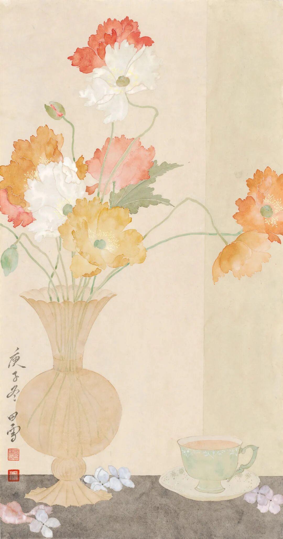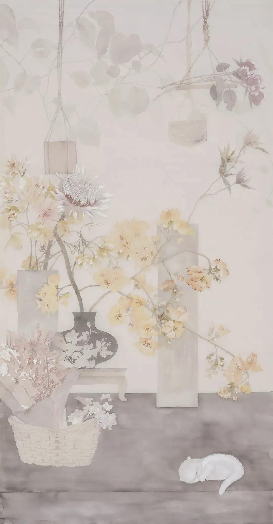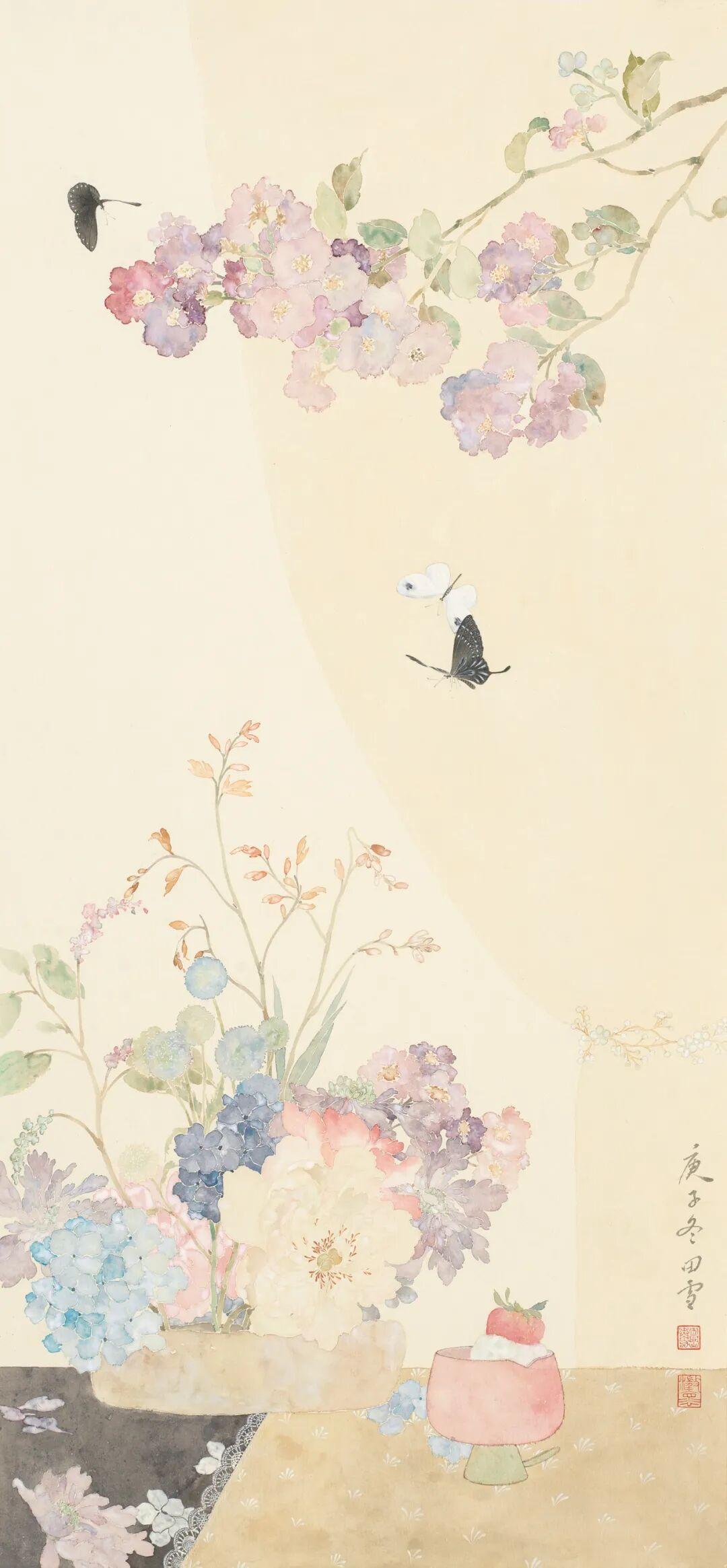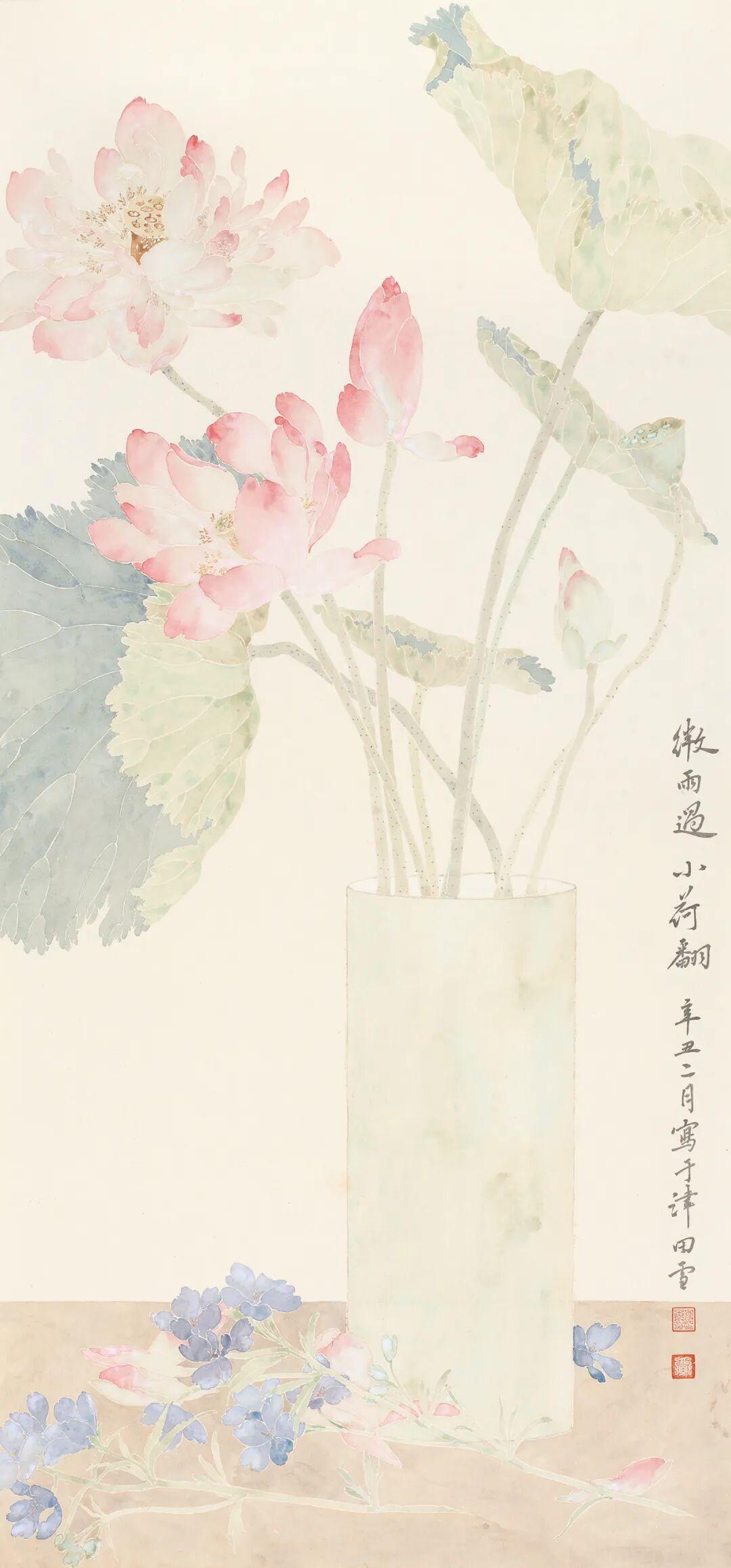 贾田雪主攻花鸟画,擅工笔喜没骨。她从小就酷爱画画,出身于绘画世家的她,自觉地承续了工笔与没骨画法结合的具有中国绘画史学文脉的花鸟画艺术传统。