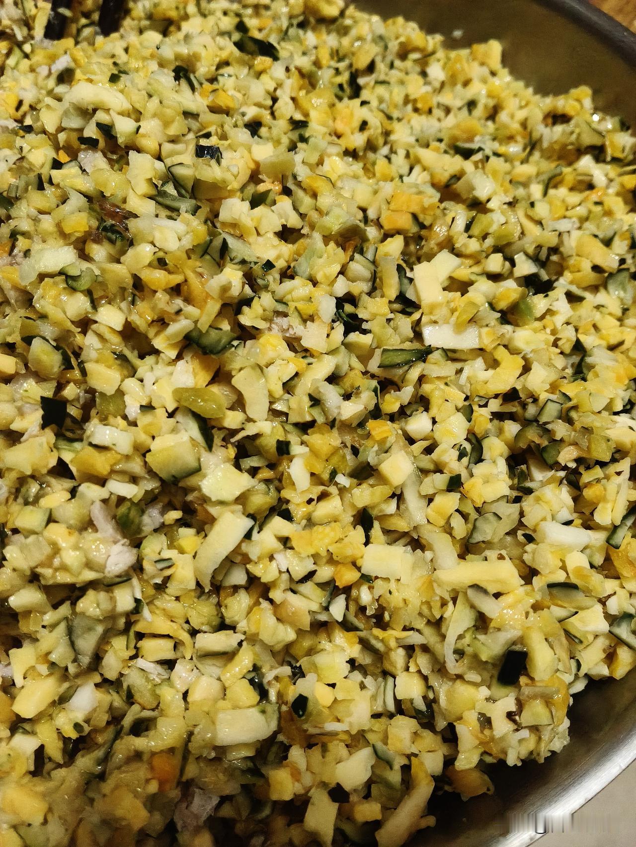 儿子想吃肉馅儿,就捞出一块儿腌肉切成小丁,把泡开的北瓜丝攥干、切碎、加盐,调成了馅儿。