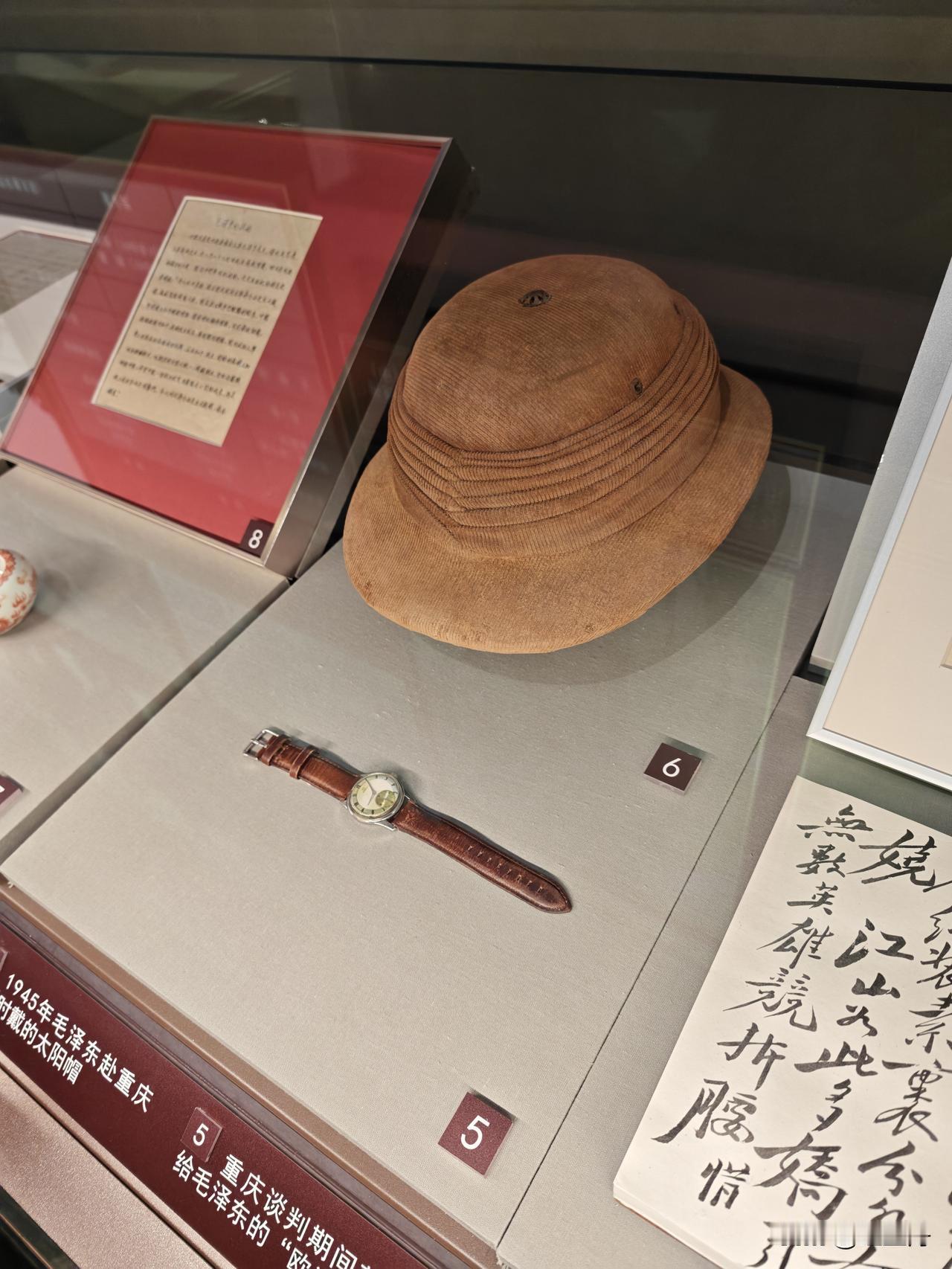 第一件是毛主席1945年8月28日赴重庆谈判戴过的咖啡色盔式遮阳帽,有史料说是周总理转送的。