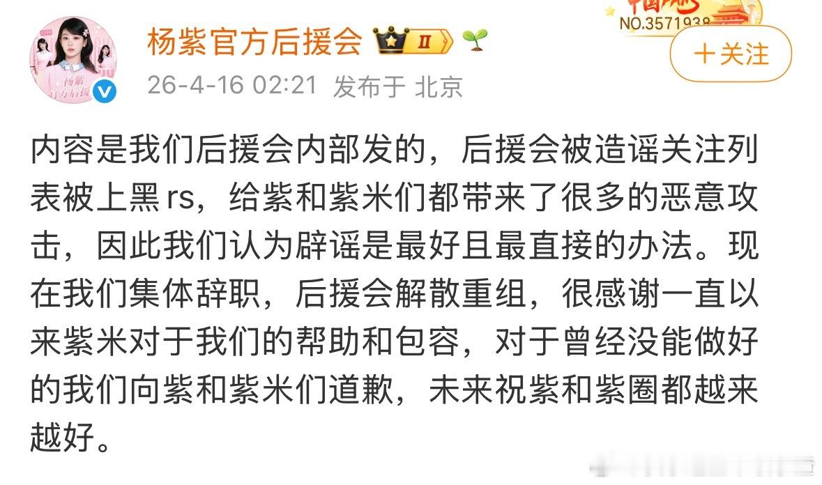杨紫后援会回应关注迪丽热巴超话后,宣布集体辞职解散重组。