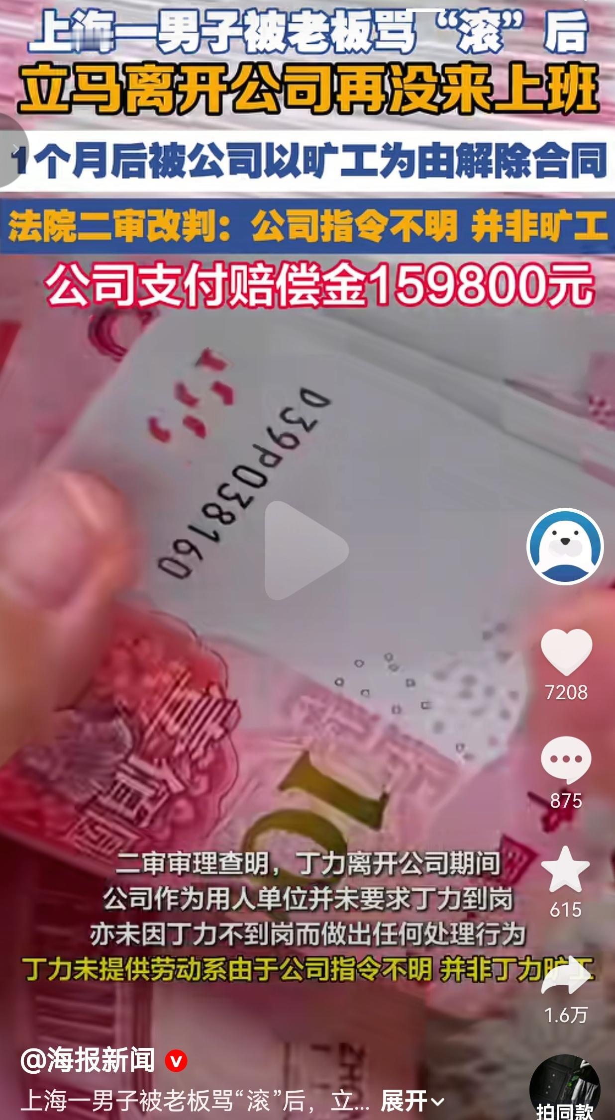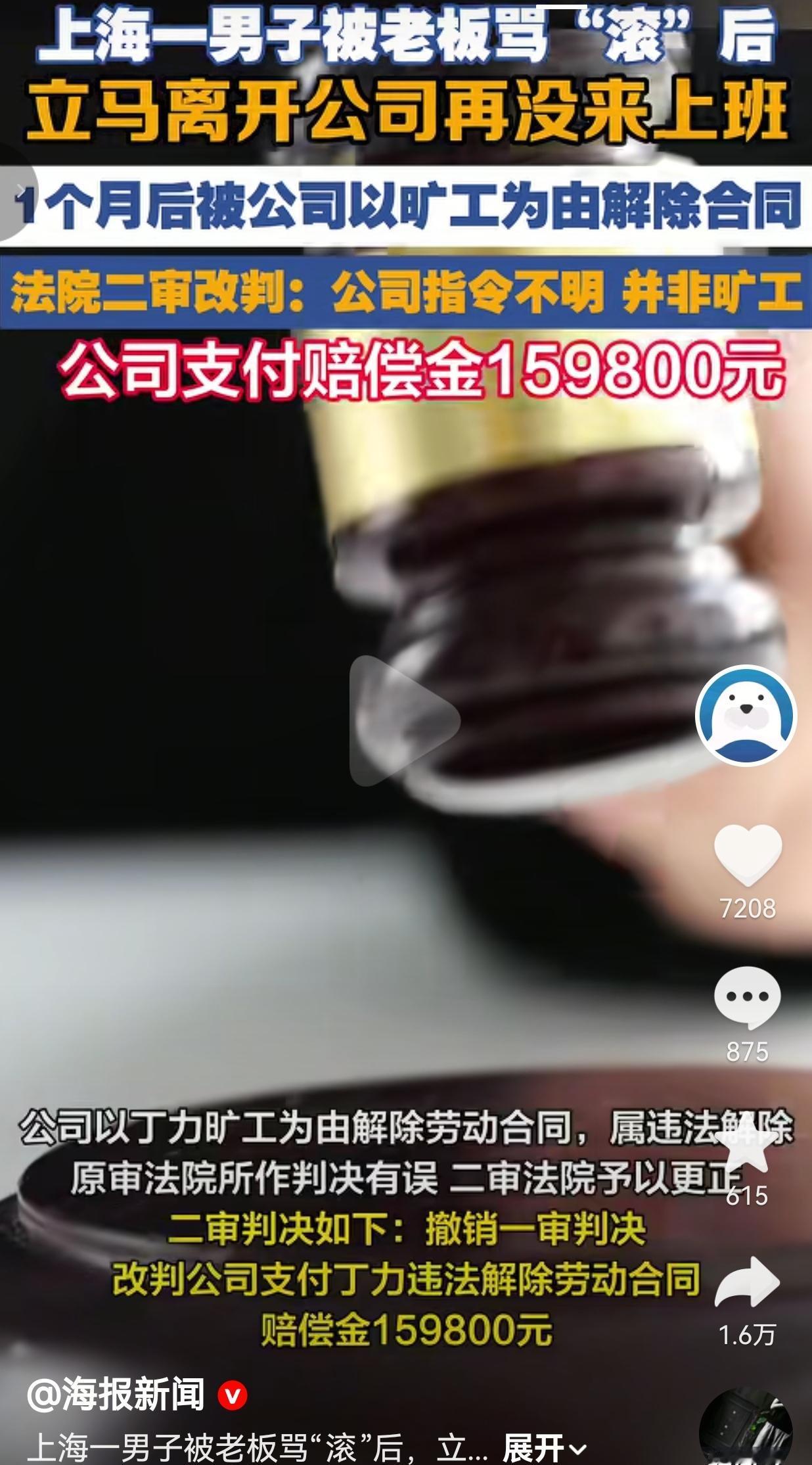 员工被老板当众骂“滚”后当场离开,公司却以“旷工”为由开除,二审法院直接改判:公司违法解除,赔偿159800元!网友:这才是法律对打工人最实在的保护!