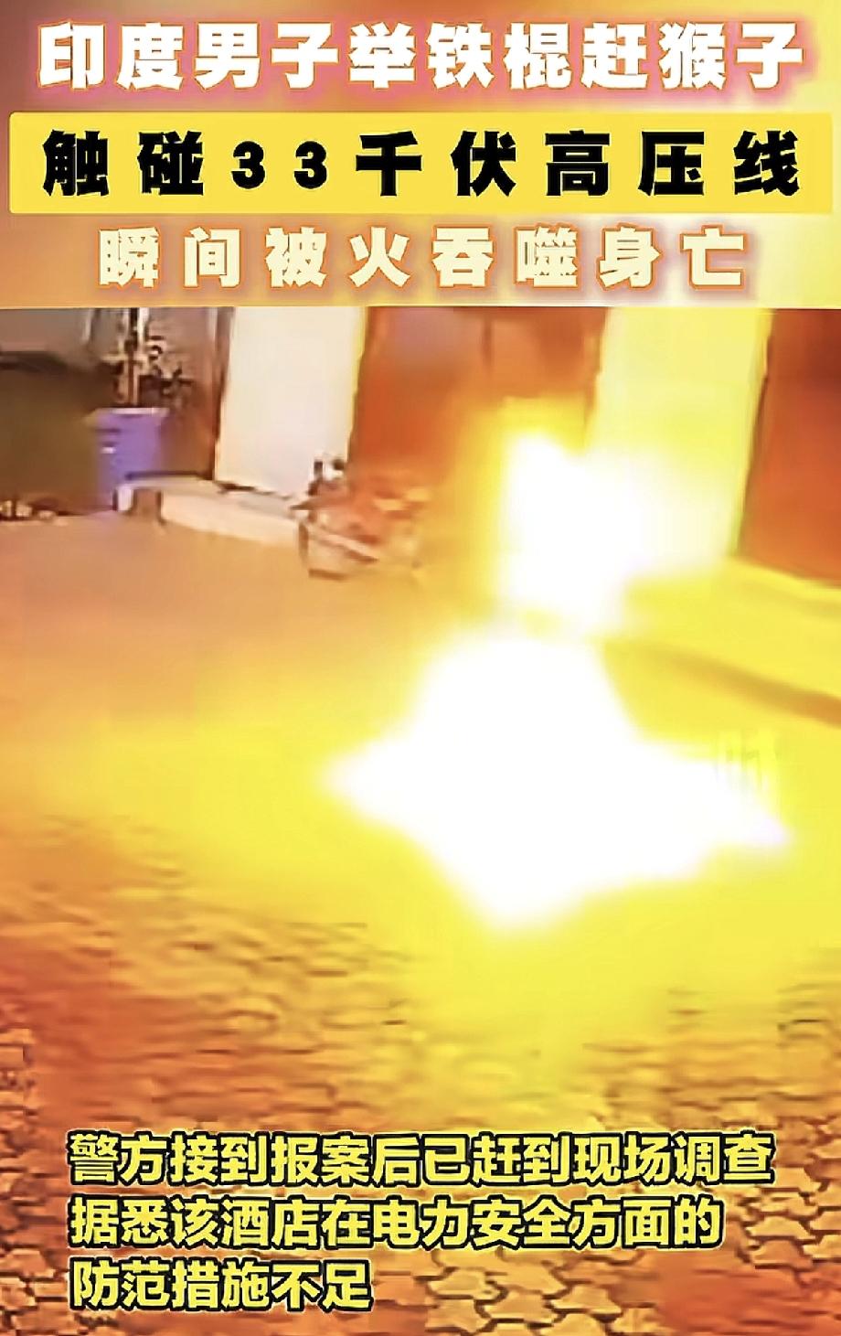 希望这样的悲剧别再发生! 三哥还有很长的路需要走啊!印度一个酒店的工作人员用铁棍去驱赶高压线上的猴子,结果不幸触电,离开了世界。 要是受到过9年义务教育的人,基本干不出来这样的事儿,拿着铁棍去碰高压线,这么危险的事儿,现在还有很多的三哥不知道。