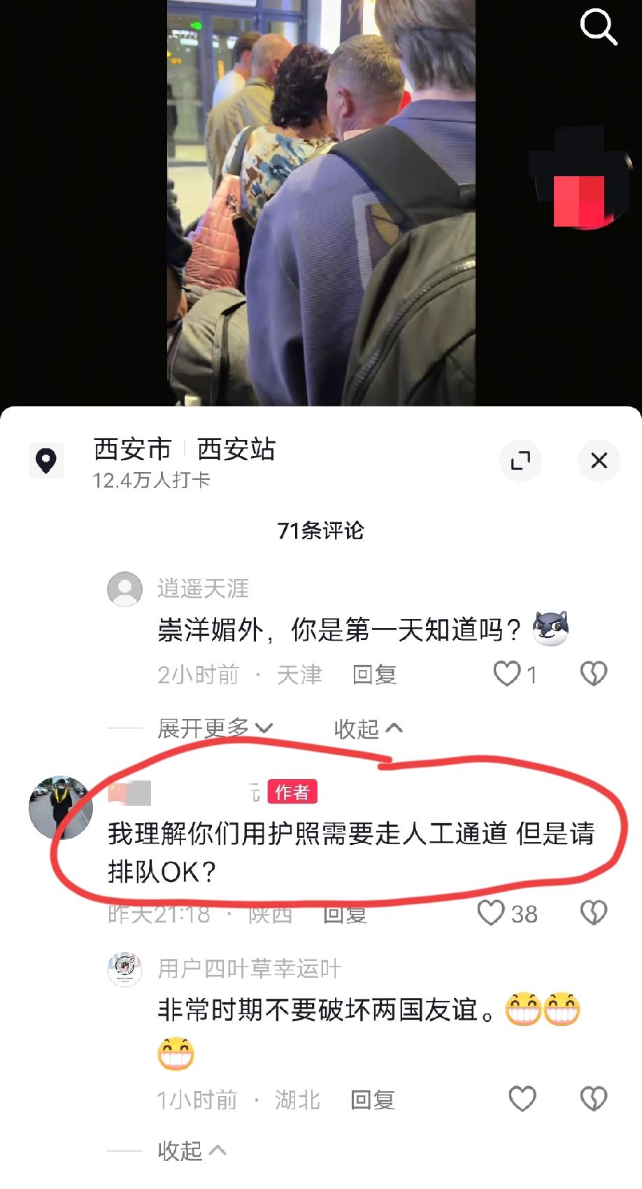 视频发布者称:我理解他们用护照需要走人工通道,但是请排队OK?
