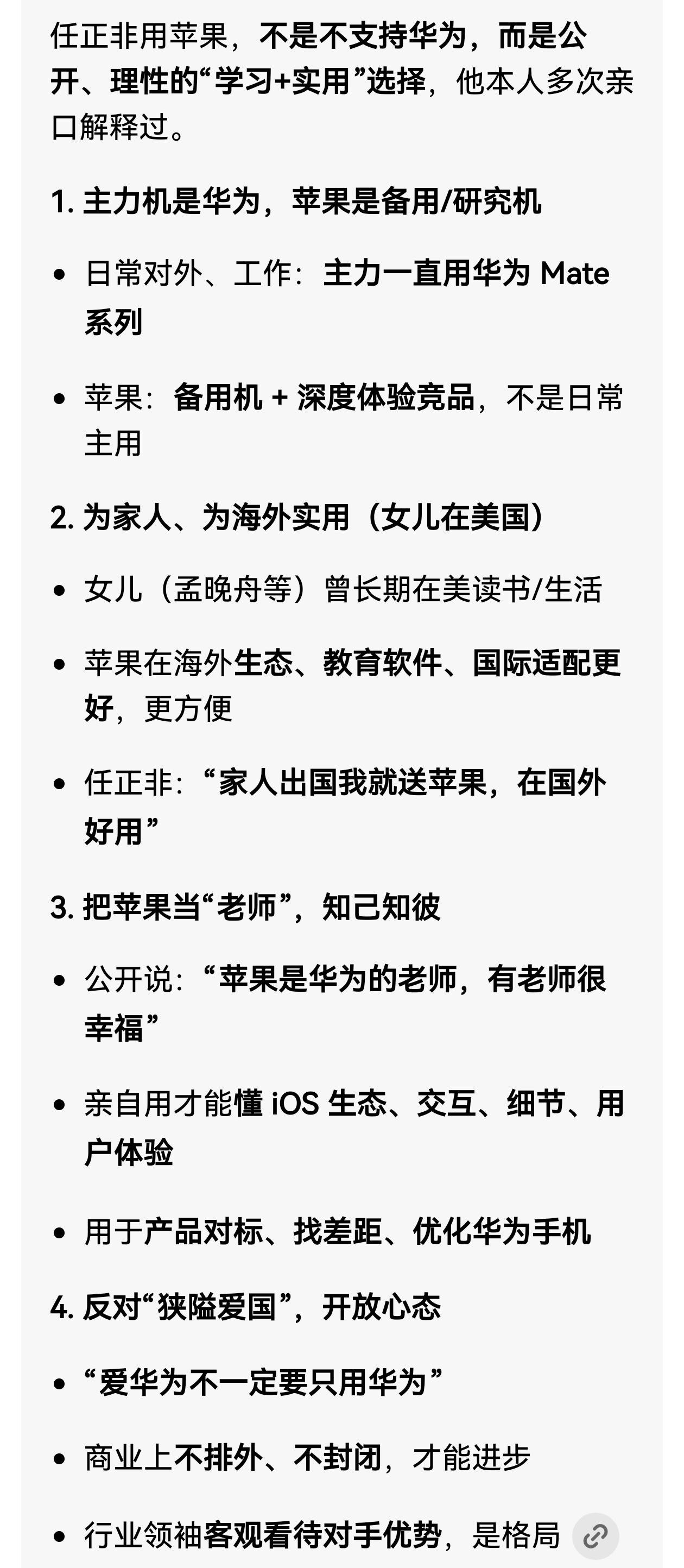 先讲任正非用苹果,根本不是不用华为。他本人公开说过,主力机一直是华为,用苹果只是为了深度研究竞品,对比华为和苹果的差距,知己知彼才能把产品做得更好,完全是出于企业发展和产品优化的考量,绝非不支持自家品牌。