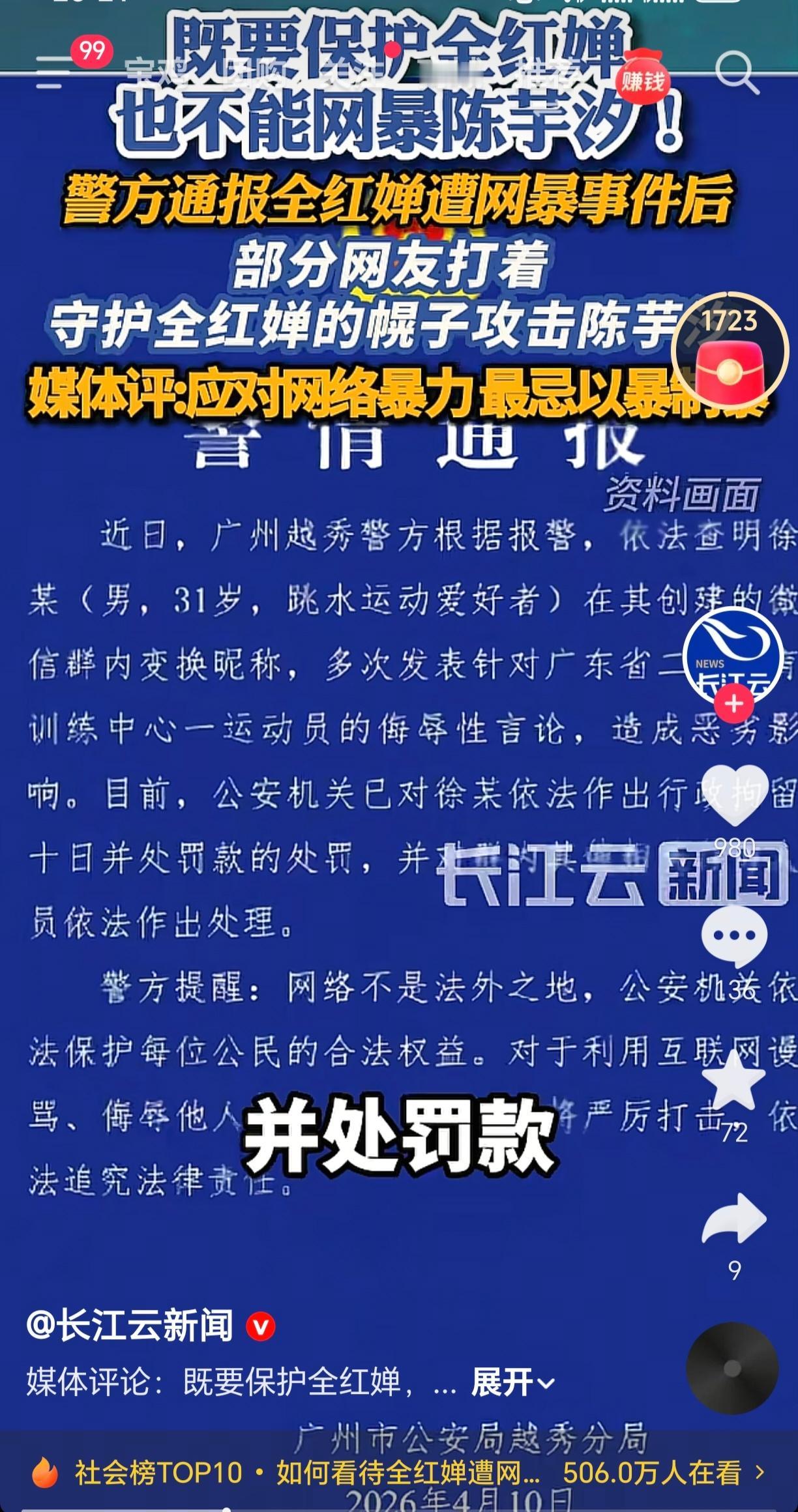 今天,看到一个消息,那就是长期网暴全红婵的群主被依法治理了。 她让水花消失了,