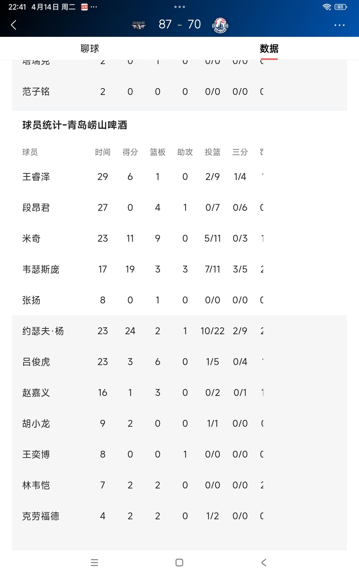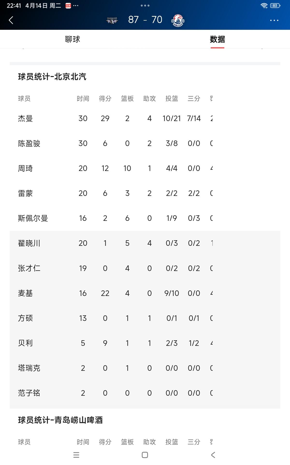 这场比赛更多的像是双方外援在互相掰手腕。从比赛数据看,北汽杰曼30分钟砍下全场最高分29分,麦基16分钟拿了22分,贝利5分钟拿了9分。青岛队韦瑟斯庞17分钟拿了19分,约瑟夫·杨23分钟拿了24分,米奇23分钟得11分。