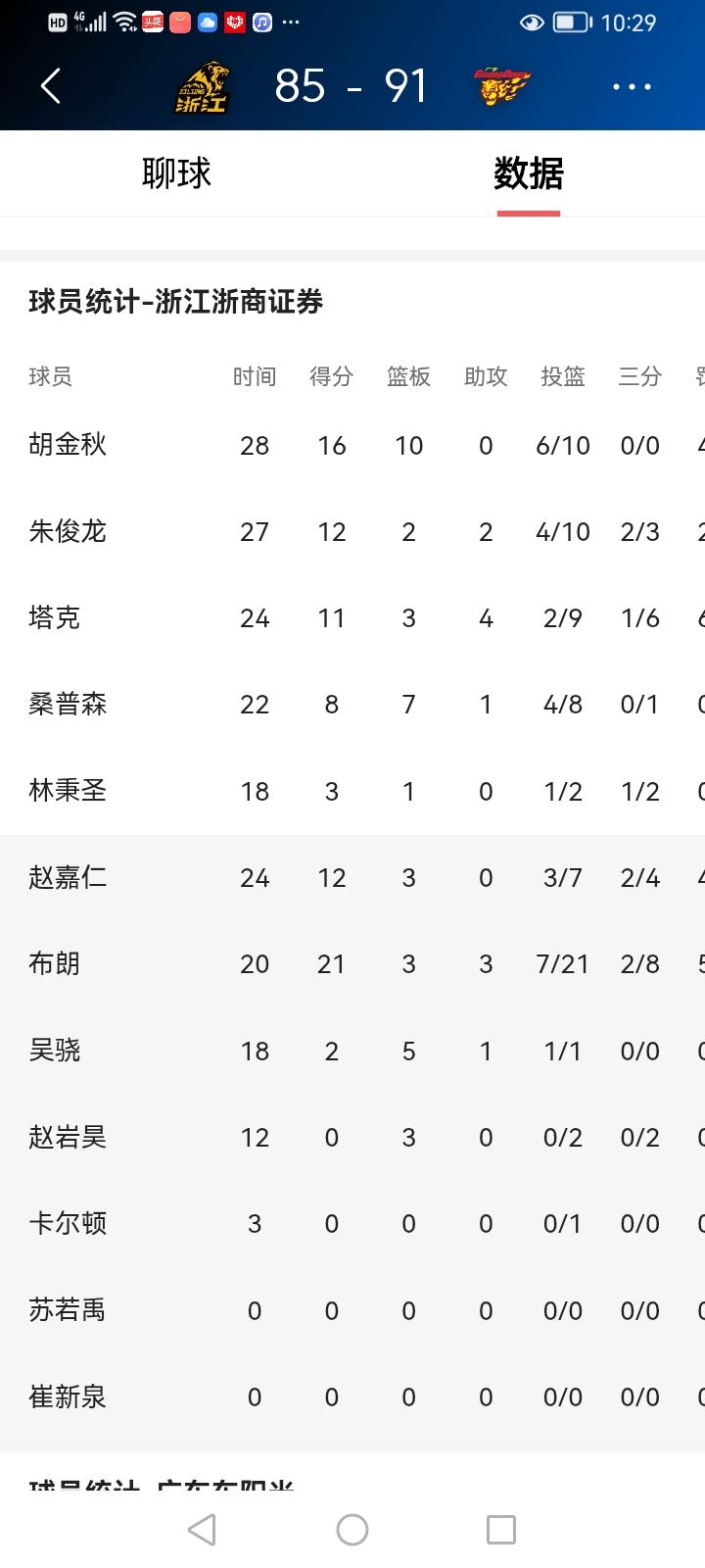 广厦队胡金秋、朱俊龙、塔克、赵嘉仁、布朗5人得分上双,最终也没能战胜3人得双看似柔弱的广东队,令人感到遗憾。