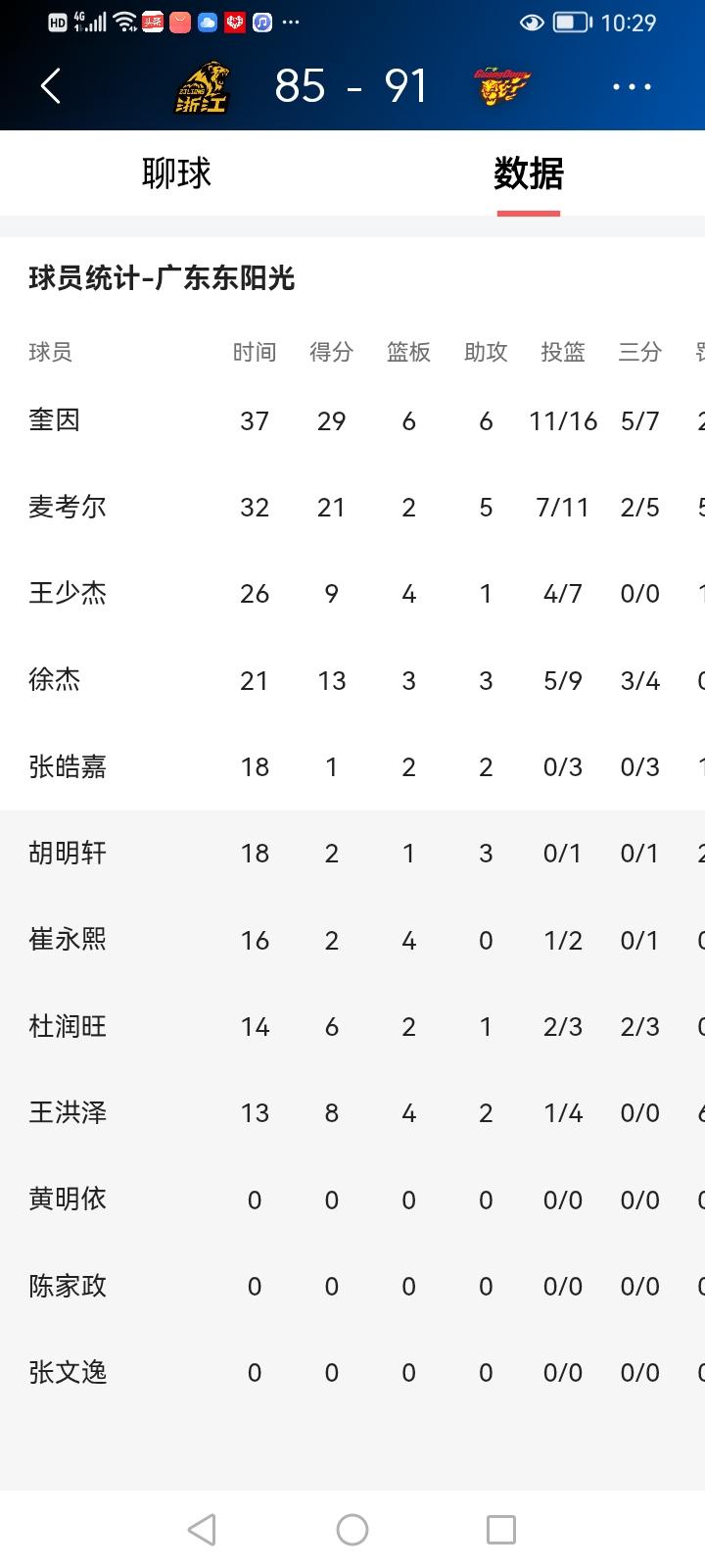 在昨天晚上广东队在外援萨林杰萨姆纳因伤缺席的情况下,凭借着3个人奎因(29分)麦考尔(21分)和徐杰(13分)的超常发挥,在客场以91:85赢了广厦队,取得了3连胜,打破了广厦主场不败的记录,也终结了广厦的3连胜。