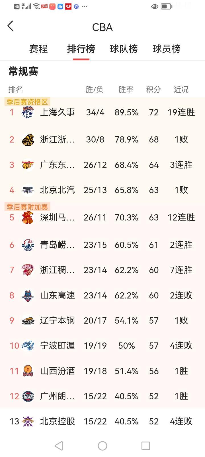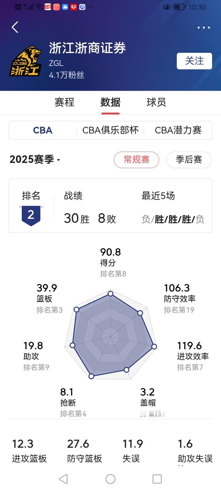 自联赛开赛以来,浙江广厦凭借着强力的外援和底蕴深厚的国内球员,目前38轮比赛赢了30场,输了8场,常规赛排名第2。场均得分90.8排名第8,篮板39.9排名第3,防守效率119.6排名第19,助攻19.8排名第9,抢断8.1排名第4,盖帽3.2排名第9。