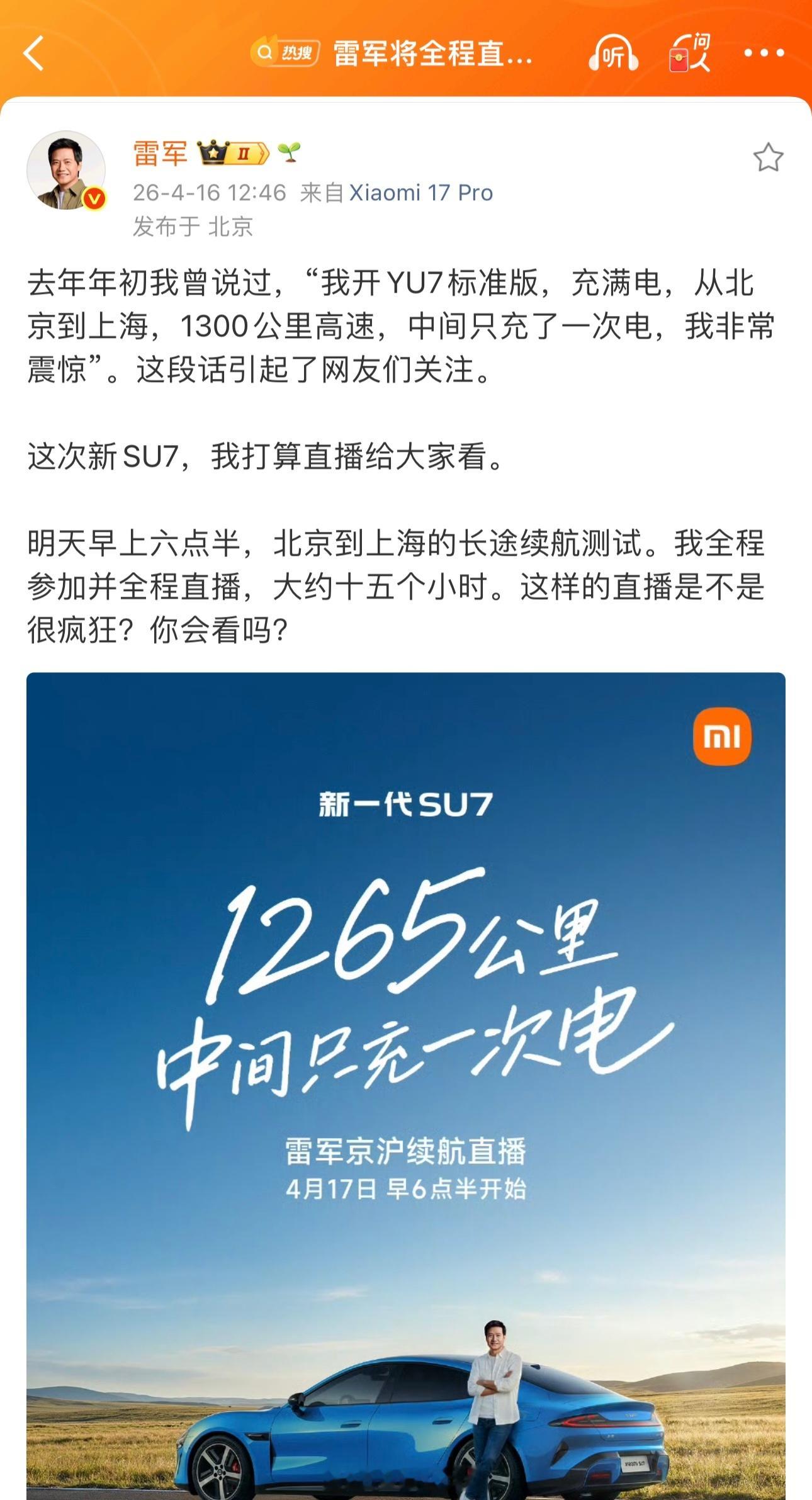 雷军将全程直播15小时雷军拼了,将直播15小时参与小米新SU7续航测试