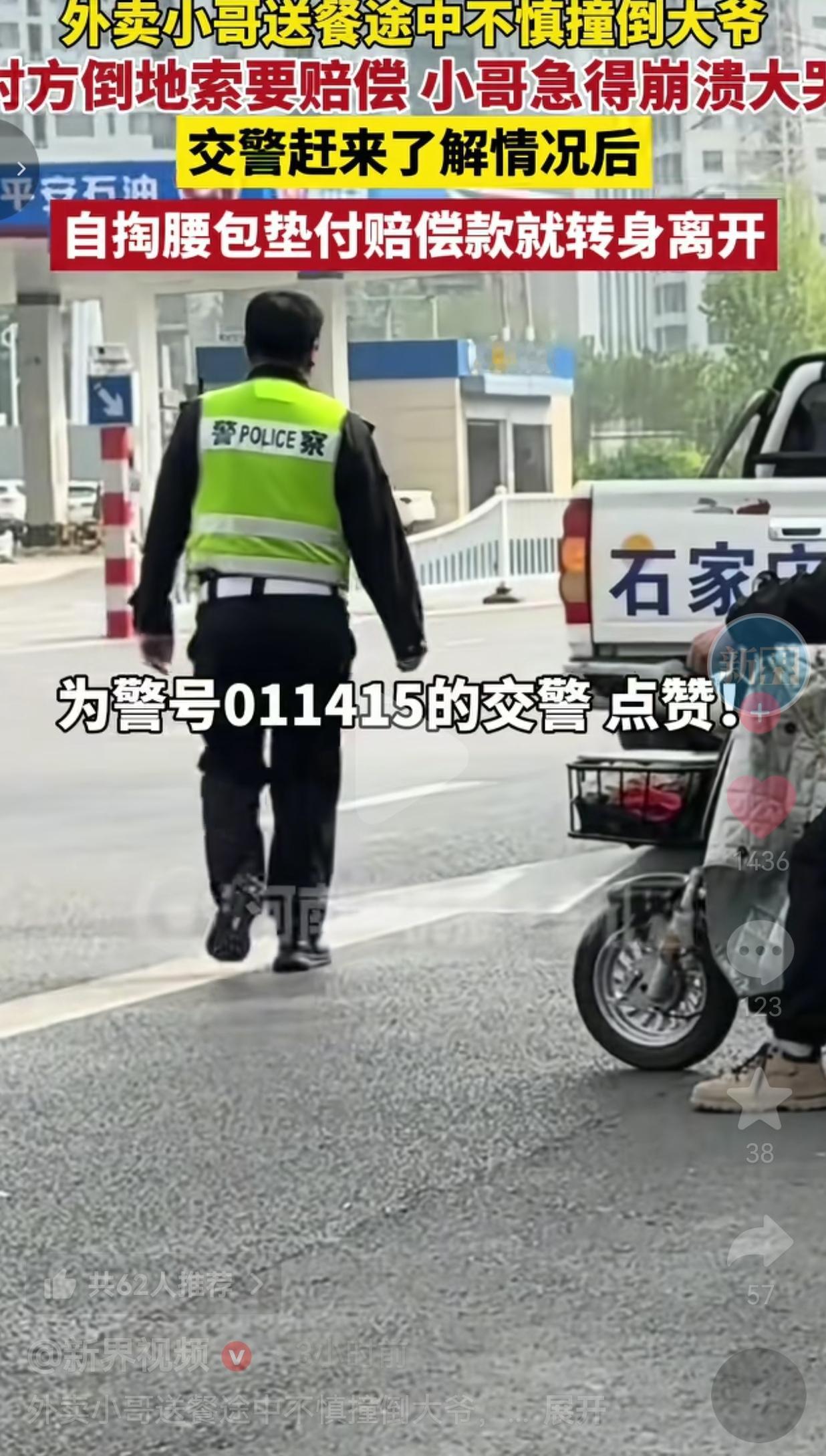 事情发生在河北石家庄的街头,一名年轻外卖小哥,为了赶送餐时间,骑车时不慎和一位大爷发生了碰撞。