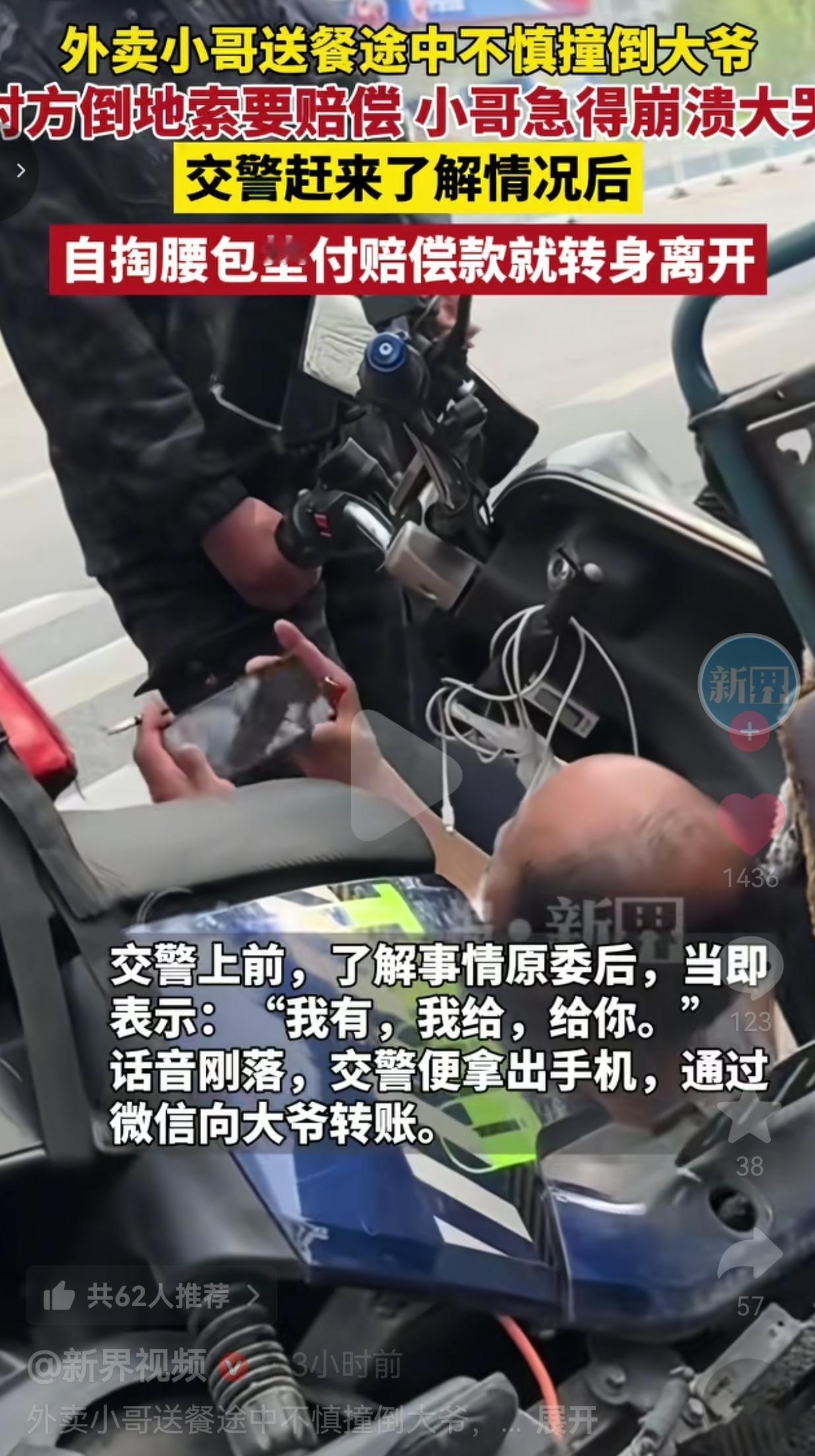 话音刚落,交警直接拿出手机,给大爷微信转了赔偿款。大爷拿到钱,立马起身骑车走了。