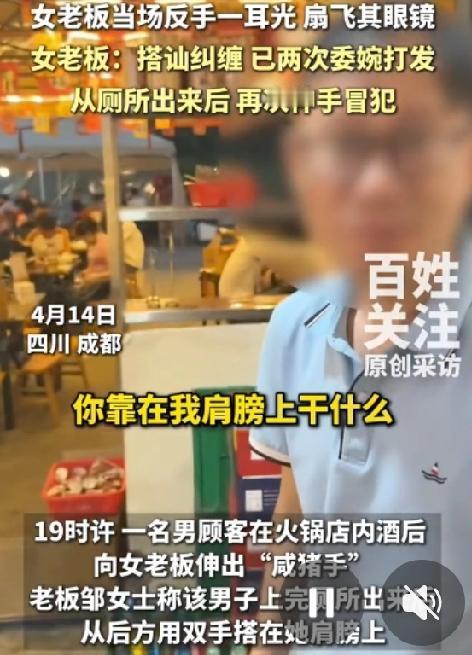 当晚,一名男顾客在该火锅店内多次向女老板邹女士伸出“咸猪手”。据邹女士事后回忆,该男子一行五人在店里用餐,前后短短十分钟内,竟三次上前搭讪她和她的朋友,其中两次还邀约她们一起喝酒。